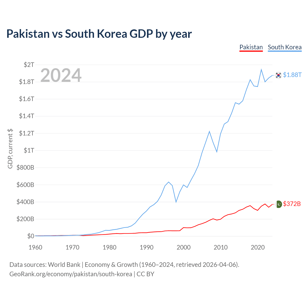 Pakistan has a GDP of $372B compared to $1.88T for South Korea, ranking 43/197 and 12/197 by economy size, respectively.