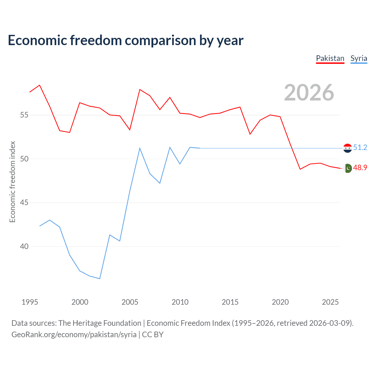 The Economic Freedom Index for Pakistan is 48.9, ranking 168/197, compared to 51.2 for Syria, ranking 155/197. The chart above displays a comparison of annual changes in economic freedom indexes.