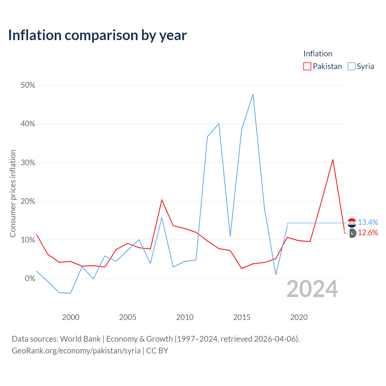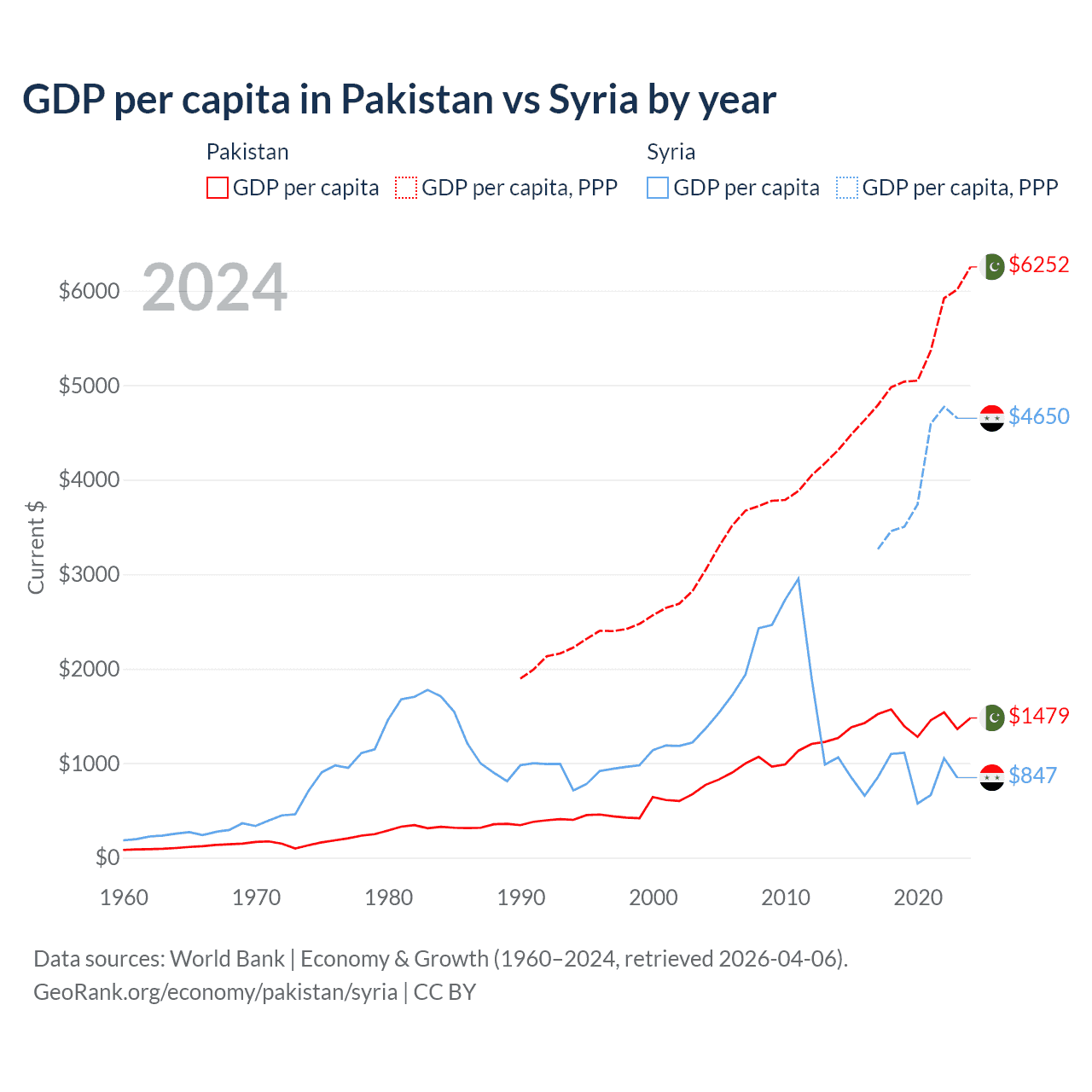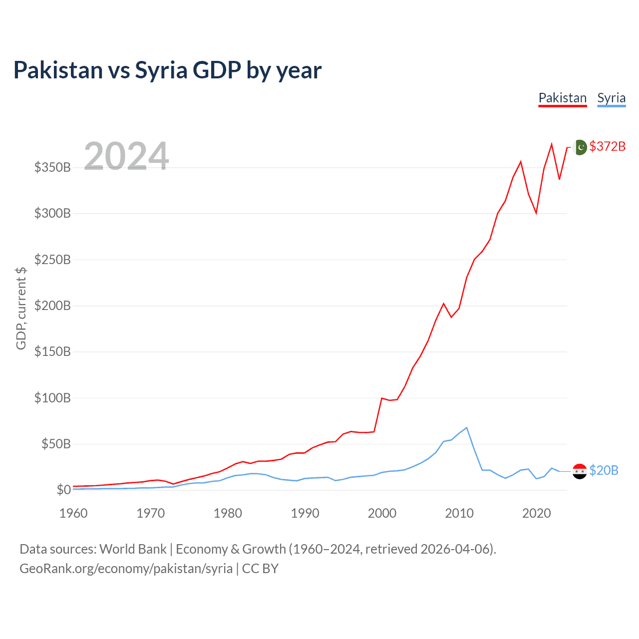 Pakistan has a GDP of $372B compared to $20B for Syria, ranking 43/197 and 129/197 by economy size, respectively.
