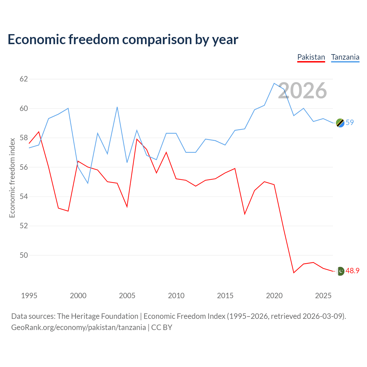 The Economic Freedom Index for Pakistan is 48.9, ranking 168/197, compared to 59 for Tanzania, ranking 106/197. The chart above displays a comparison of annual changes in economic freedom indexes.