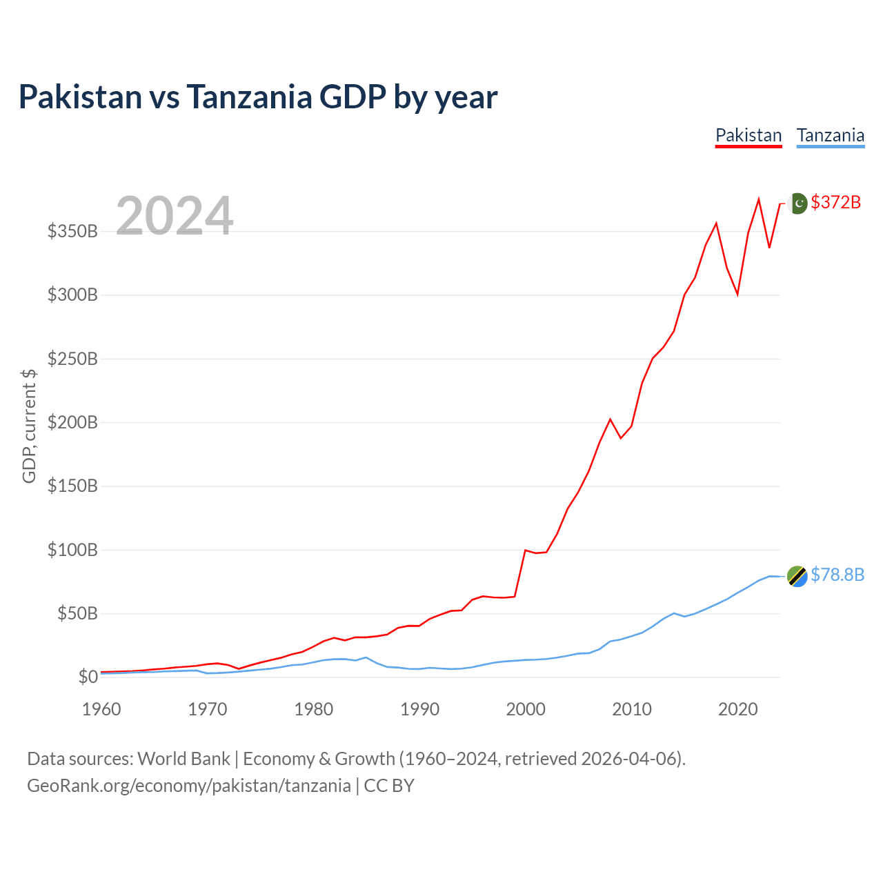 Pakistan has a GDP of $372B compared to $78.8B for Tanzania, ranking 43/197 and 82/197 by economy size, respectively.