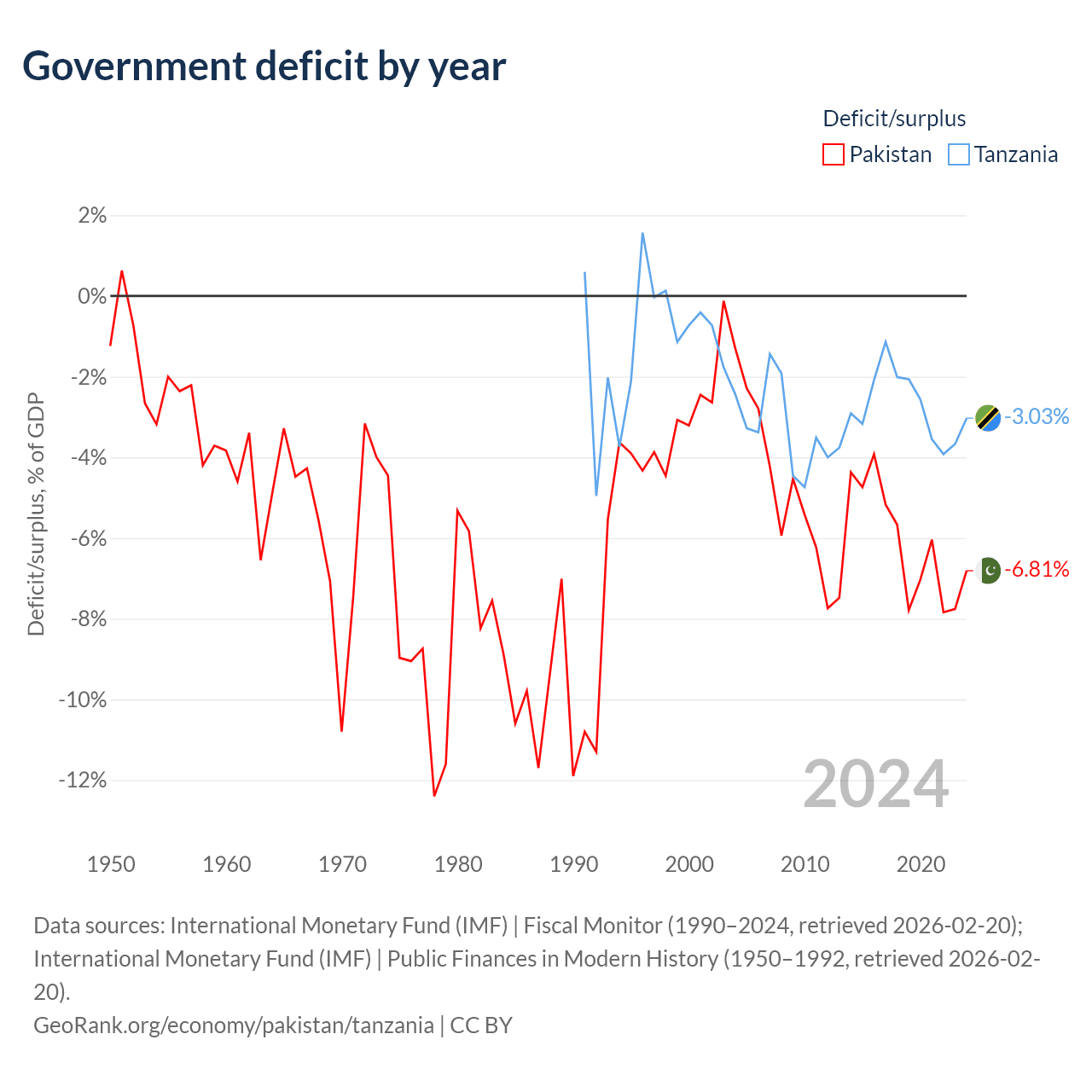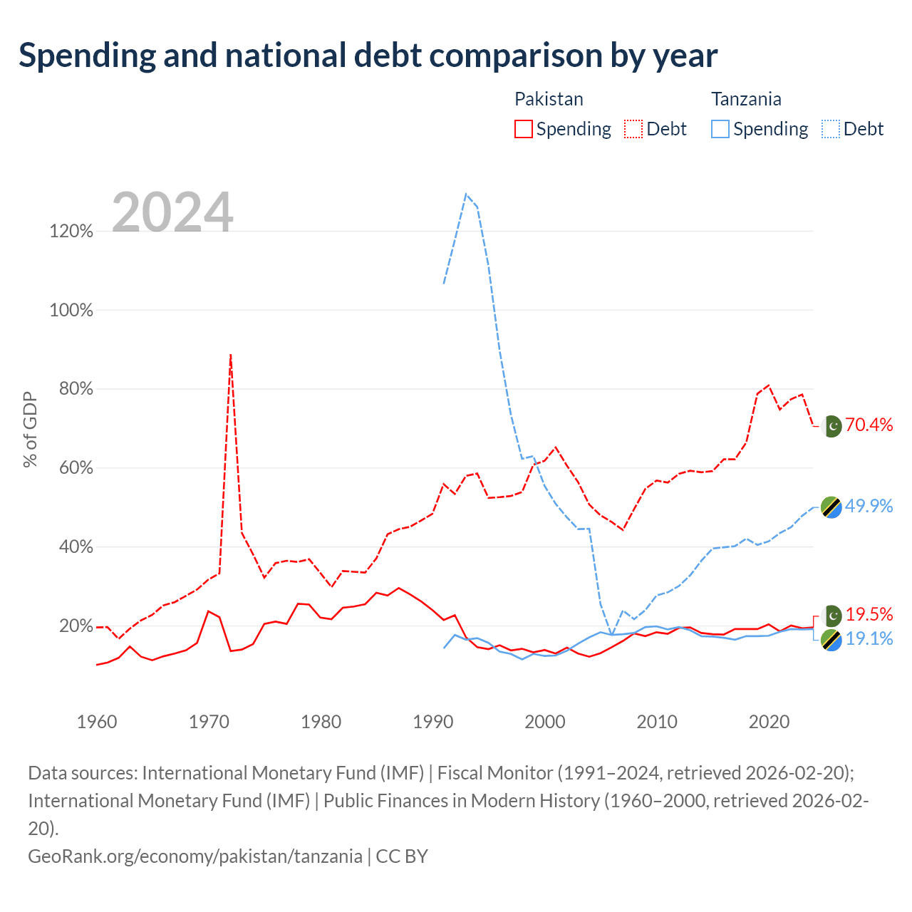 Pakistan has $262B in government debt (70.4% of GDP), compared to $39.3B (49.9% of GDP) in Tanzania.