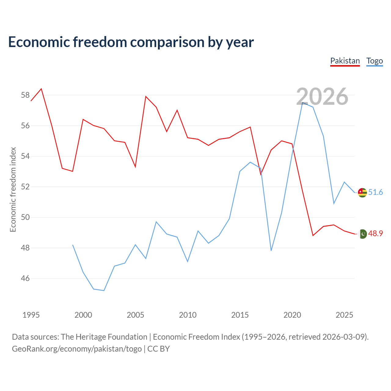 The Economic Freedom Index for Pakistan is 48.9, ranking 168/197, compared to 51.6 for Togo, ranking 153/197. The chart above displays a comparison of annual changes in economic freedom indexes.