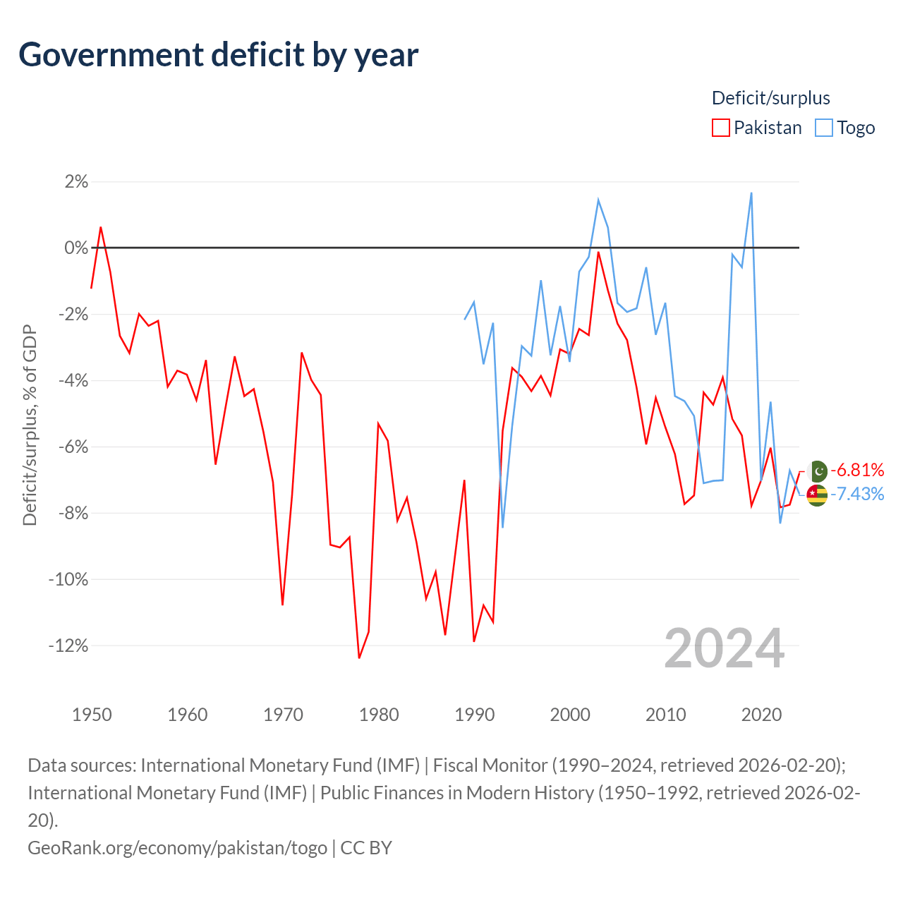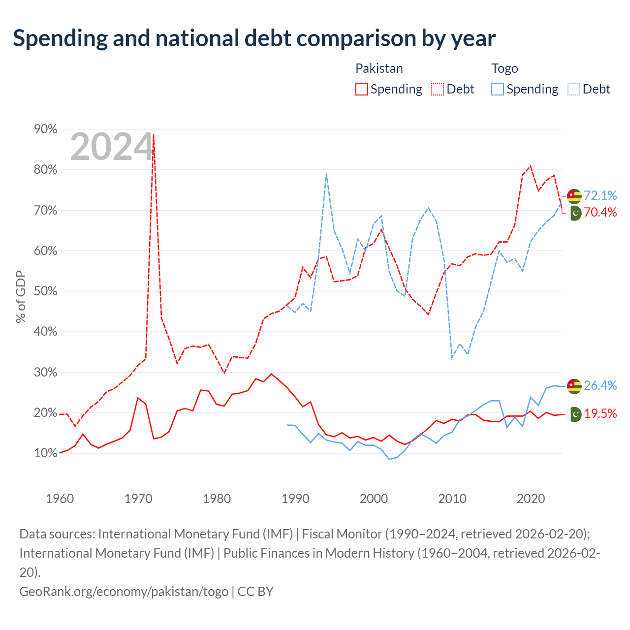 Pakistan has $262B in government debt (70.4% of GDP), compared to $7.68B (72.1% of GDP) in Togo.