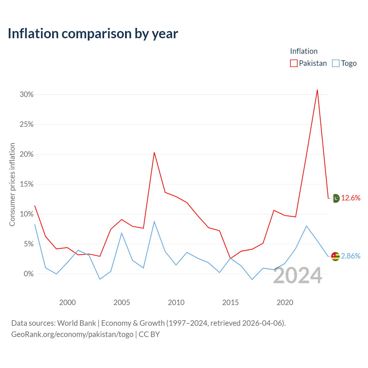 Pakistan has a GDP of $372B compared to $10.7B for Togo, ranking 43/197 and 154/197 by economy size, respectively.