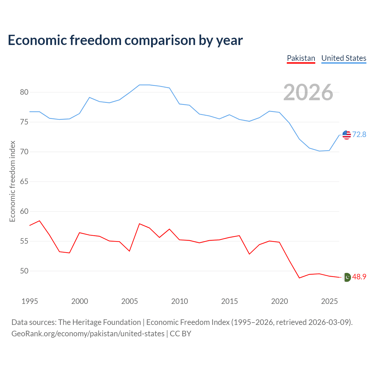 The Economic Freedom Index for Pakistan is 48.9, ranking 168/197, compared to 72.8 for the United States, ranking 27/197. The chart above displays a comparison of annual changes in economic freedom indexes.