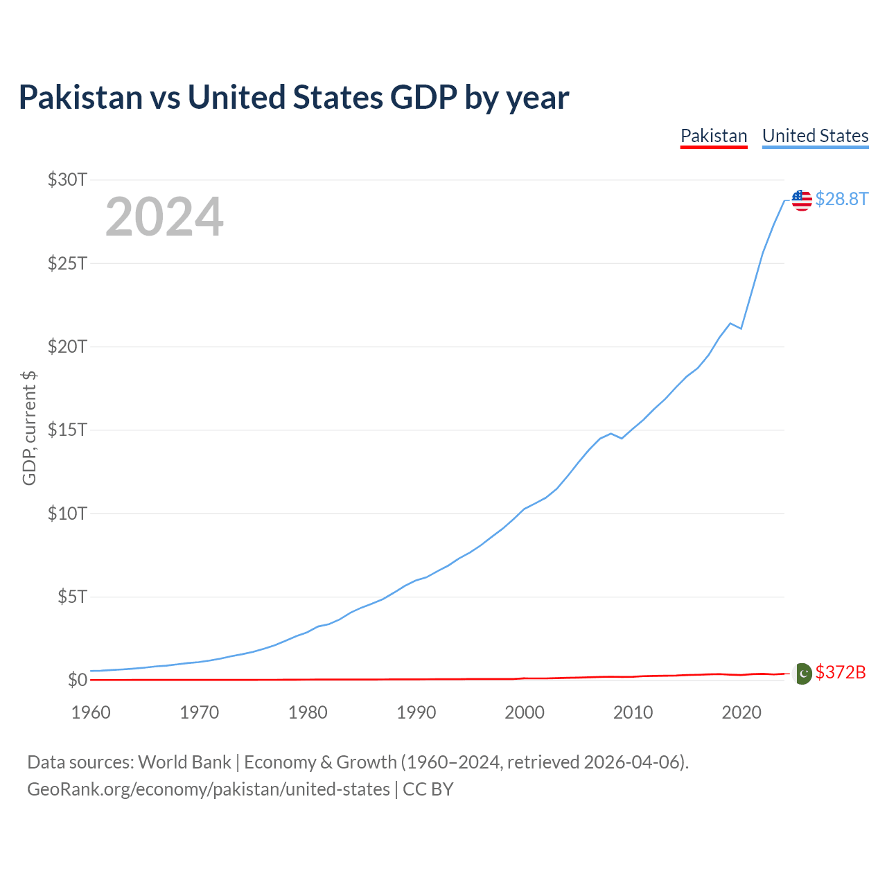 Pakistan has a GDP of $372B compared to $28.8T for the United States, ranking 43/197 and 1/197 by economy size, respectively.
