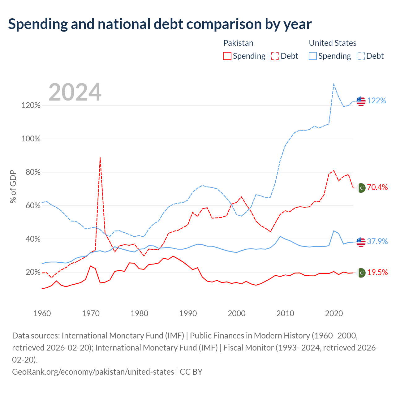 Pakistan has $262B in government debt (70.4% of GDP), compared to $35.2T (122.3% of GDP) in the United States.