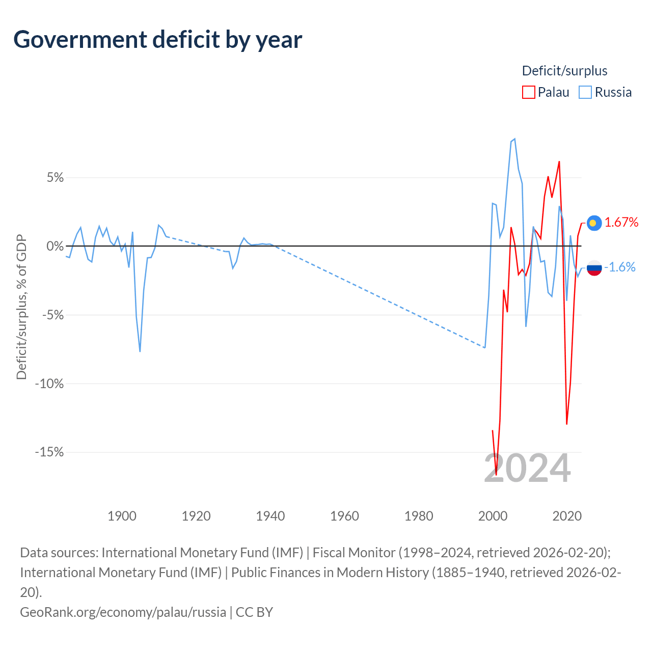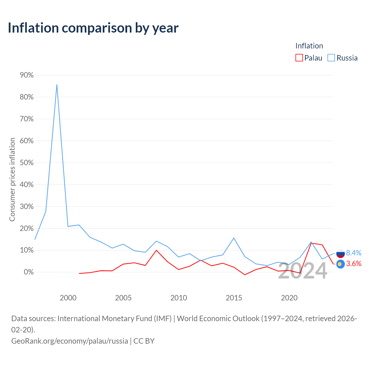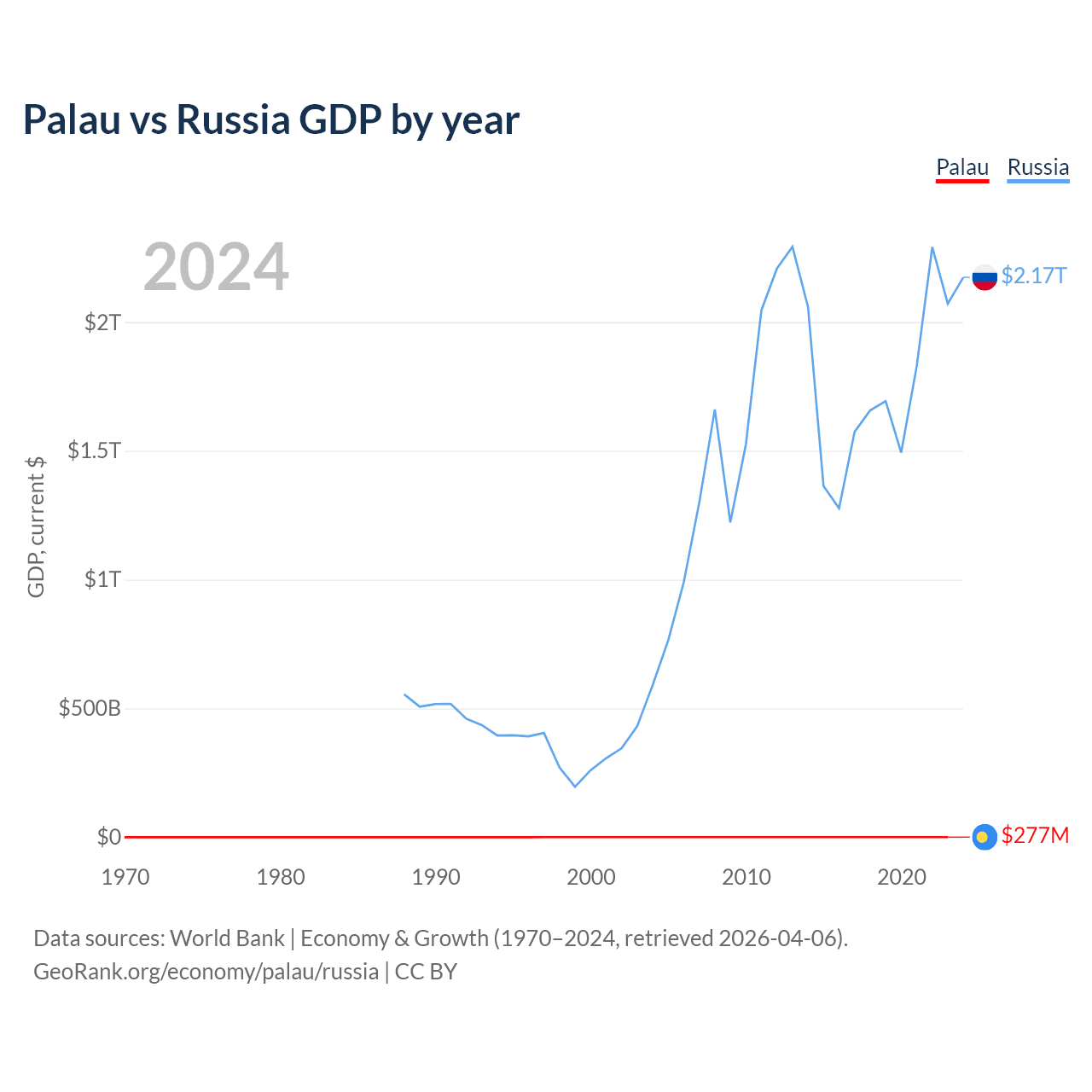Palau has a GDP of $277M compared to $2.17T for Russia, ranking 194/197 and 11/197 by economy size, respectively.