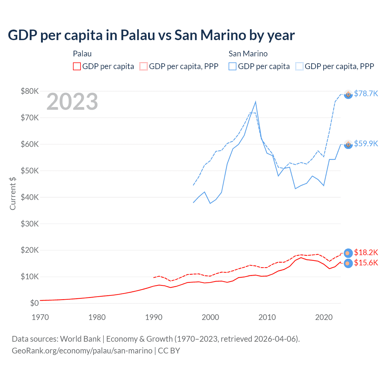 GDP per capita in Palau vs San Marino by year
