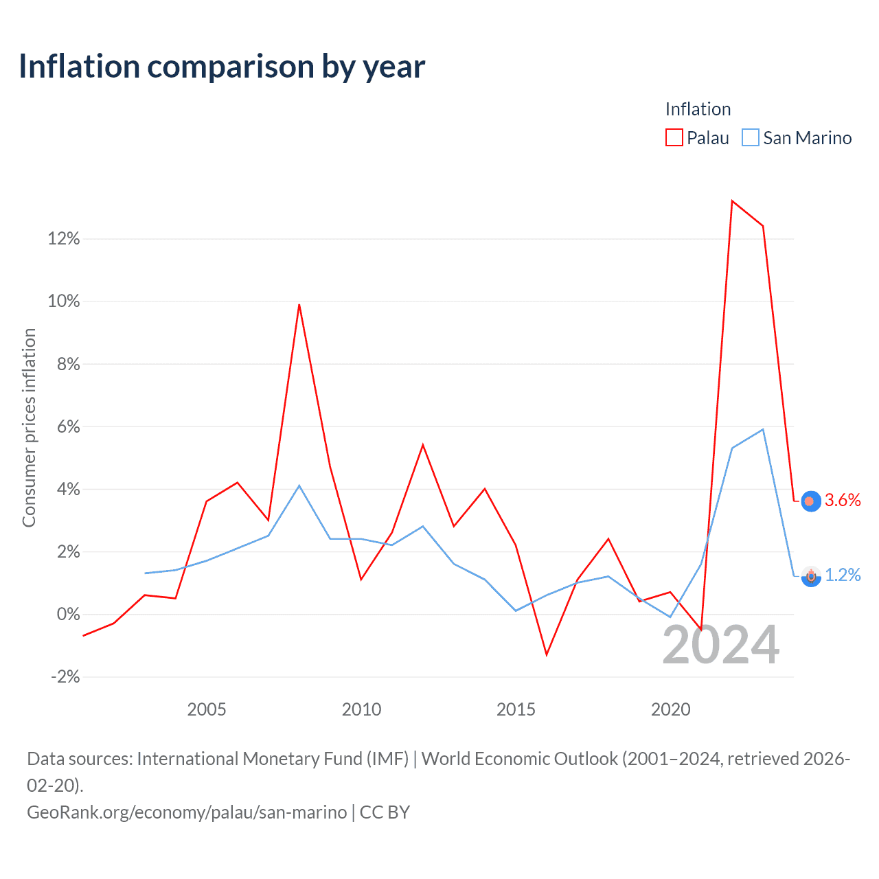 Over the past 22 years, Palau has recorded an average annual inflation rate of 3.48%, compared with 1.95% in San Marino. In 2024, inflation was 3.6% in Palau and 1.2% in San Marino.