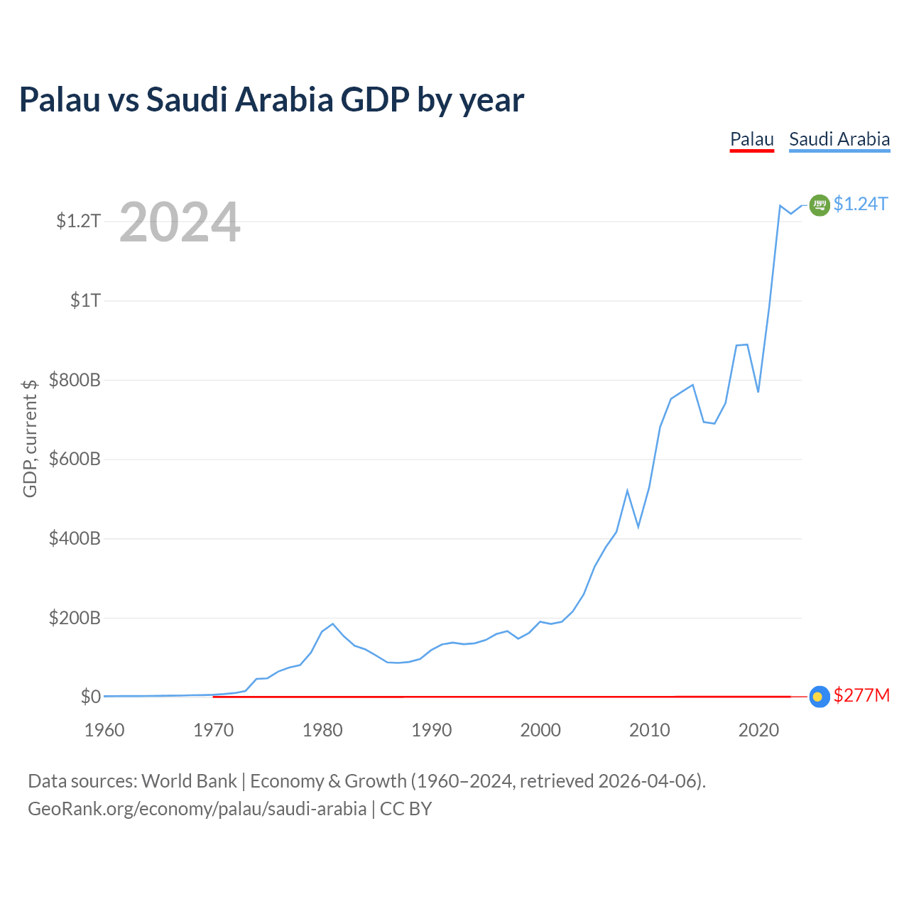 Palau has a GDP of $277M compared to $1.24T for Saudi Arabia, ranking 194/197 and 18/197 by economy size, respectively.