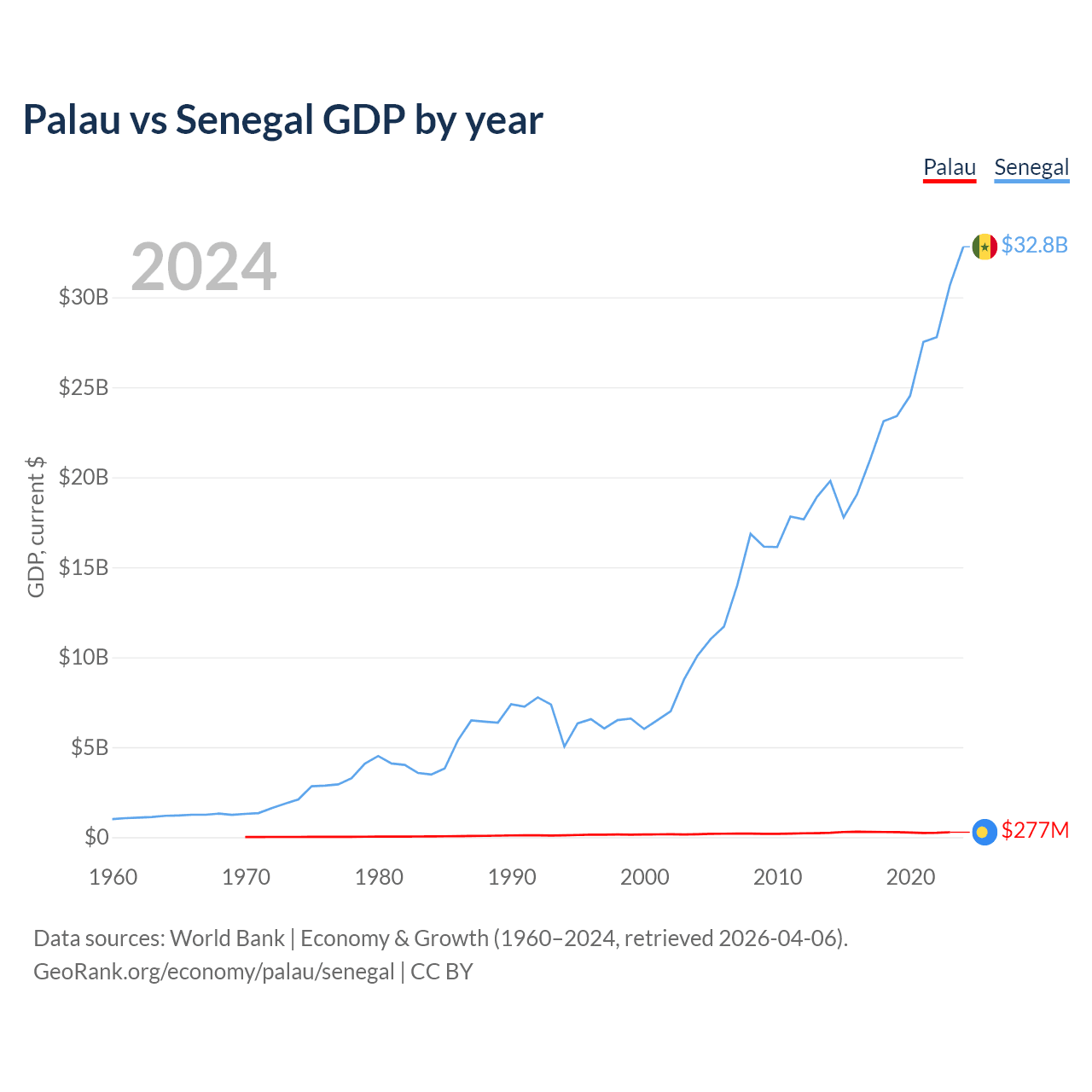 Palau has a GDP of $277M compared to $32.8B for Senegal, ranking 194/197 and 109/197 by economy size, respectively.