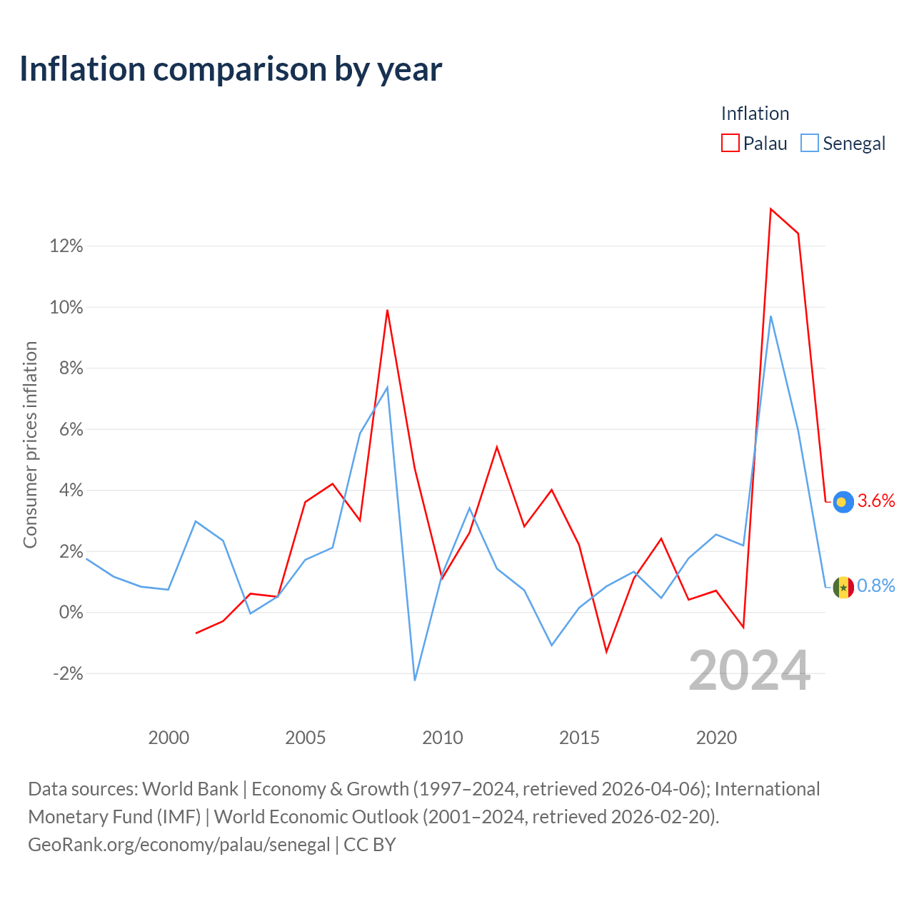 Over the past 24 years, Palau has recorded an average annual inflation rate of 3.15%, compared with 2.16% in Senegal. In 2024, inflation was 3.6% in Palau and 0.8% in Senegal.