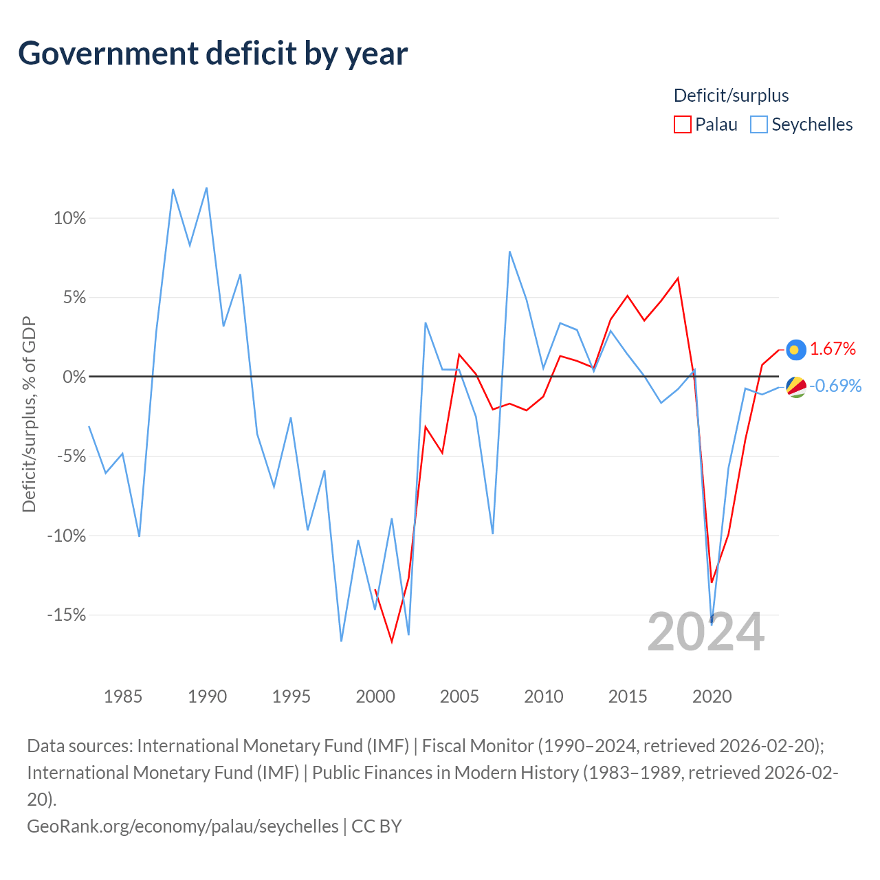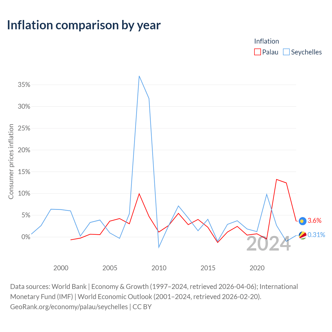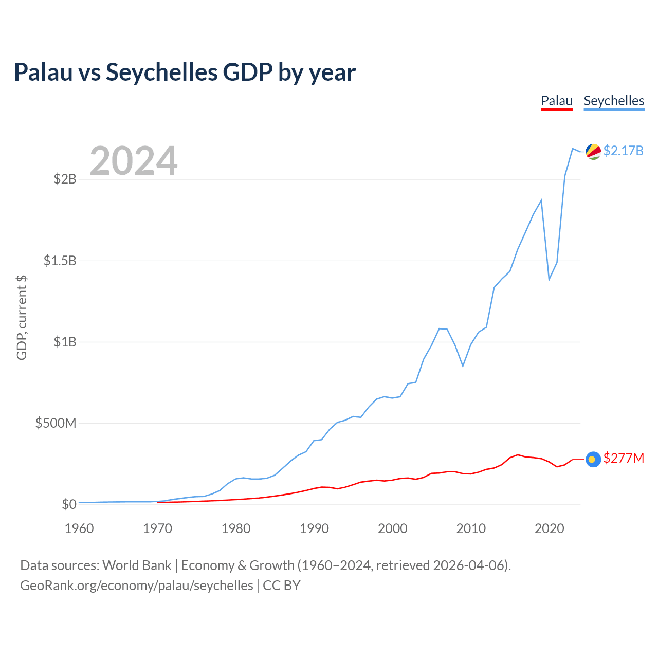 Palau has a GDP of $277M compared to $2.17B for the Seychelles, ranking 194/197 and 178/197 by economy size, respectively.