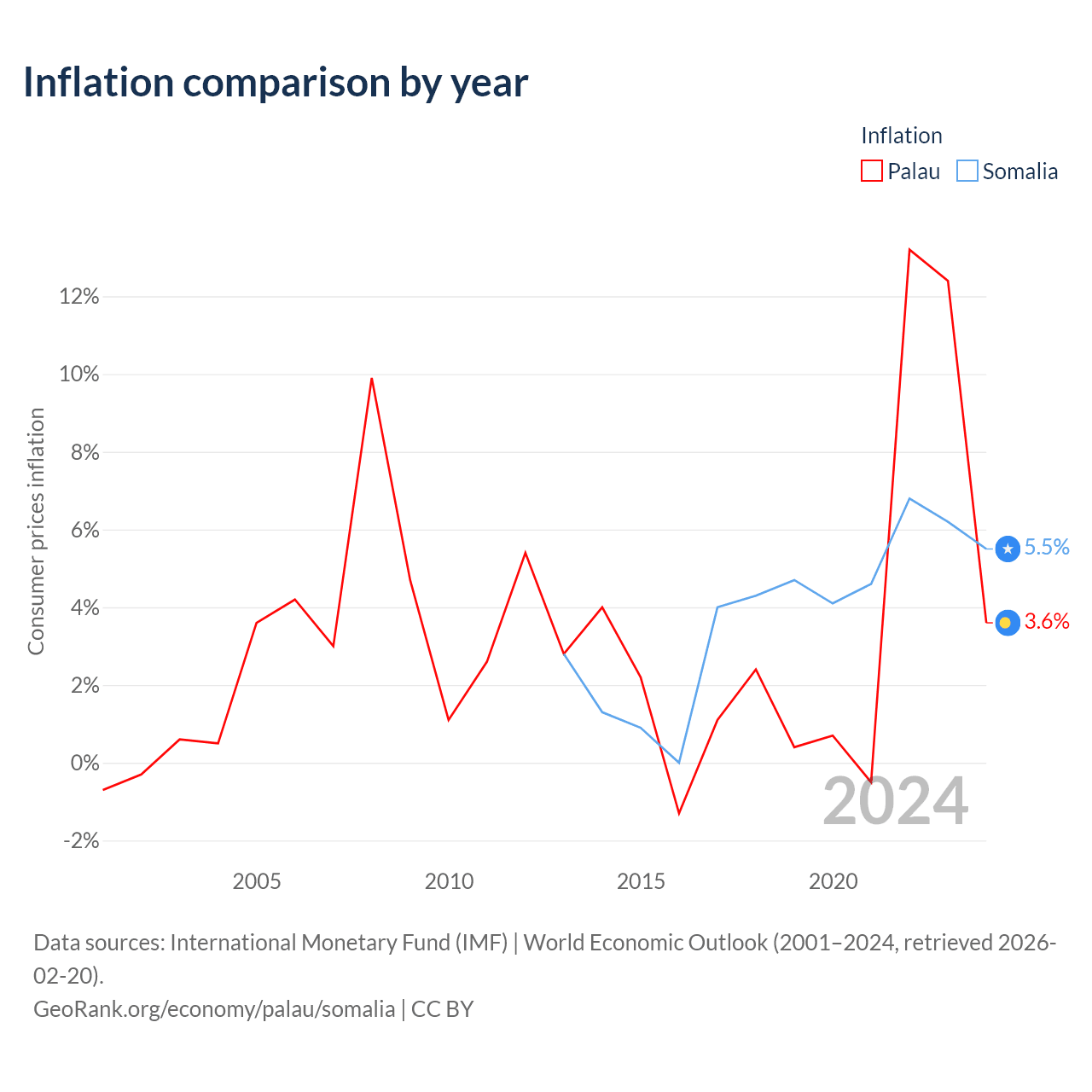 Over the past 12 years, Palau has recorded an average annual inflation rate of 3.42%, compared with 3.77% in Somalia. In 2024, inflation was 3.6% in Palau and 5.5% in Somalia.