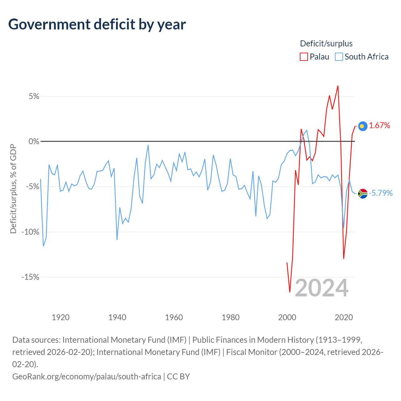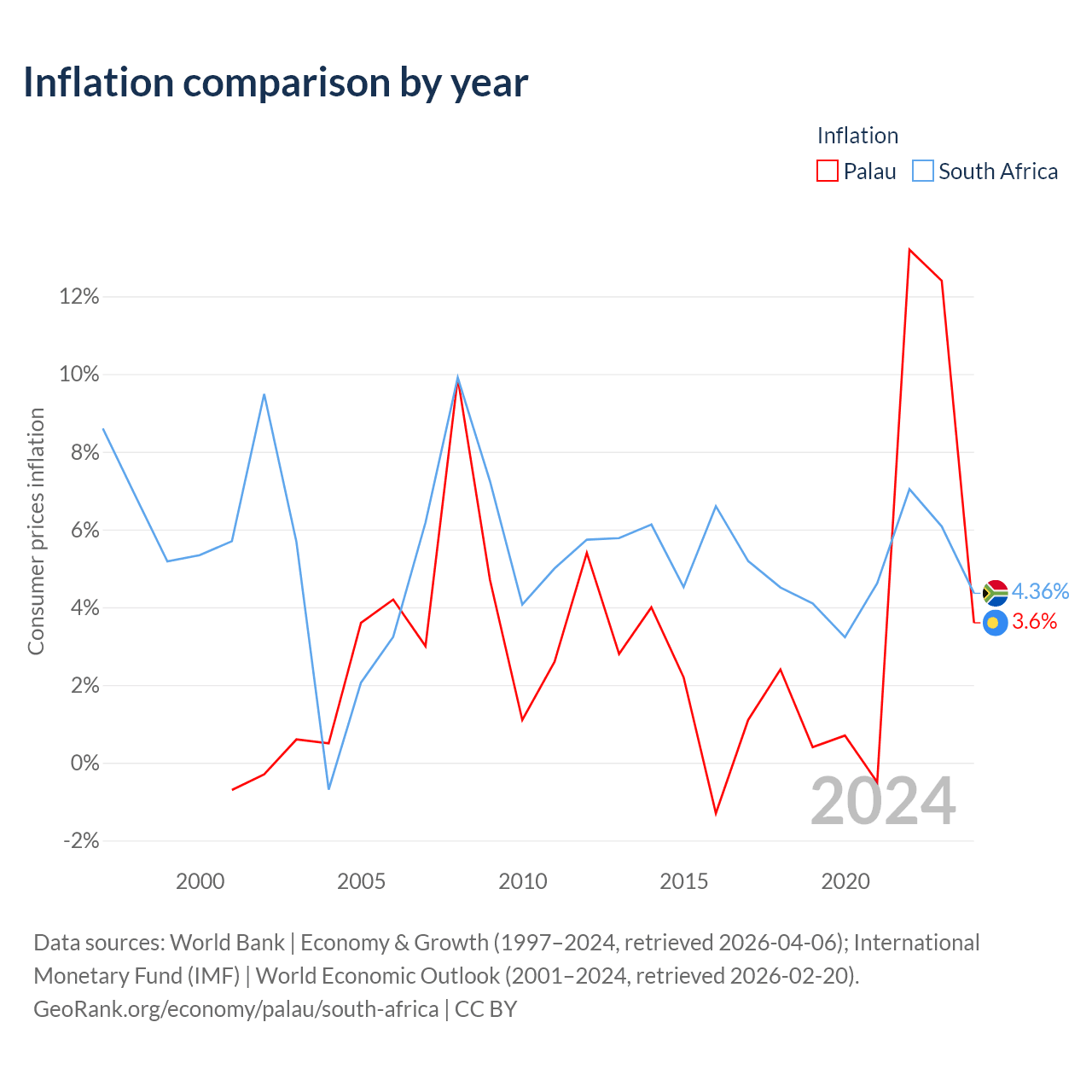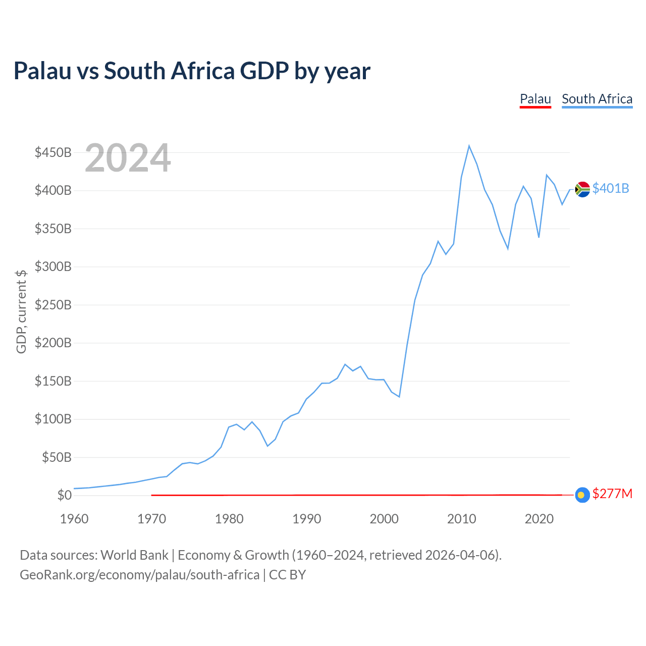 Palau has a GDP of $277M compared to $401B for South Africa, ranking 194/197 and 40/197 by economy size, respectively.