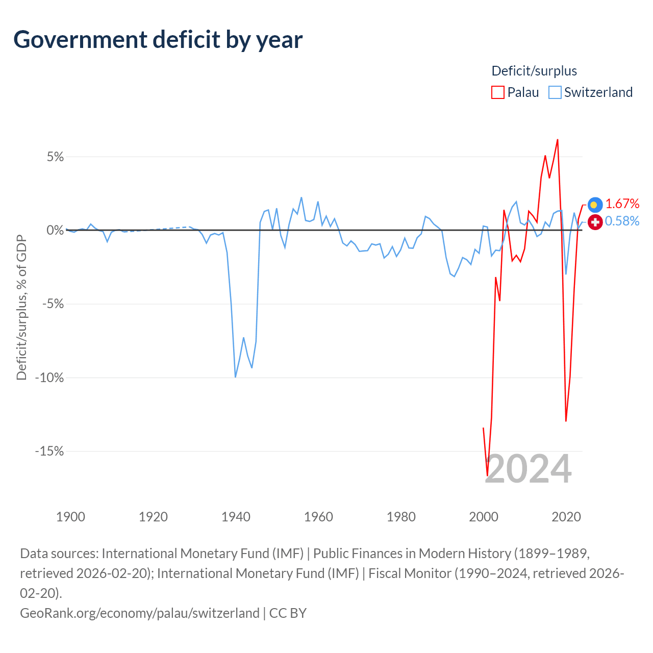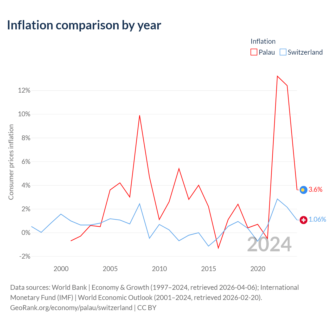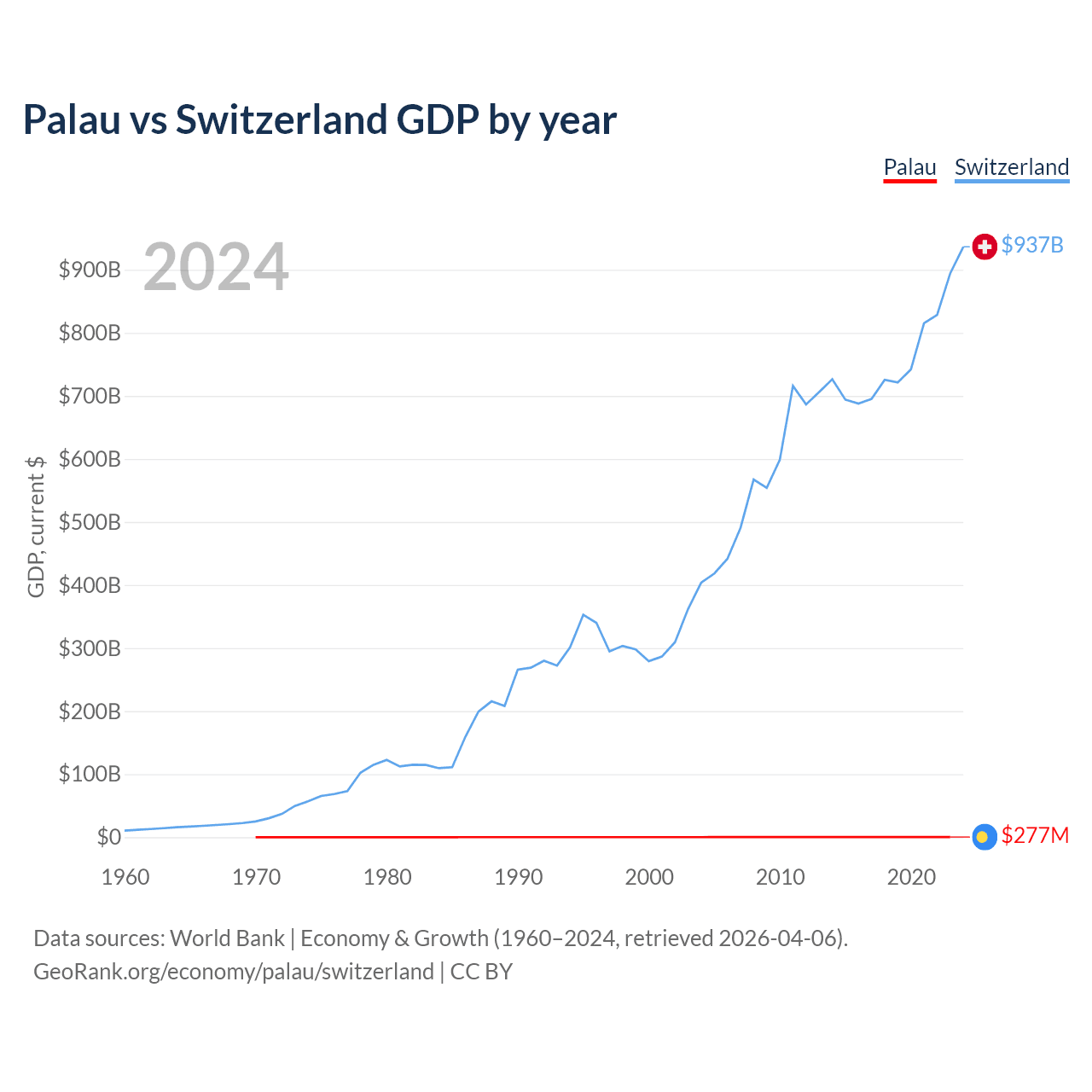 Palau has a GDP of $277M compared to $937B for Switzerland, ranking 194/197 and 20/197 by economy size, respectively.