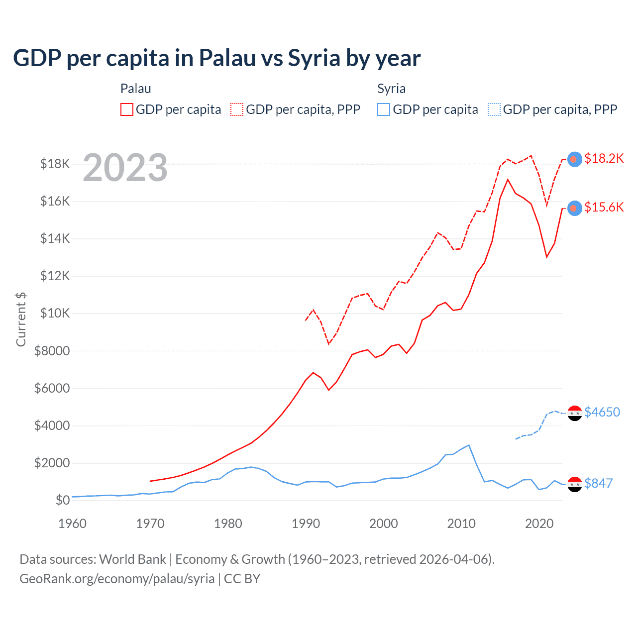 GDP per capita in Palau vs Syria by year