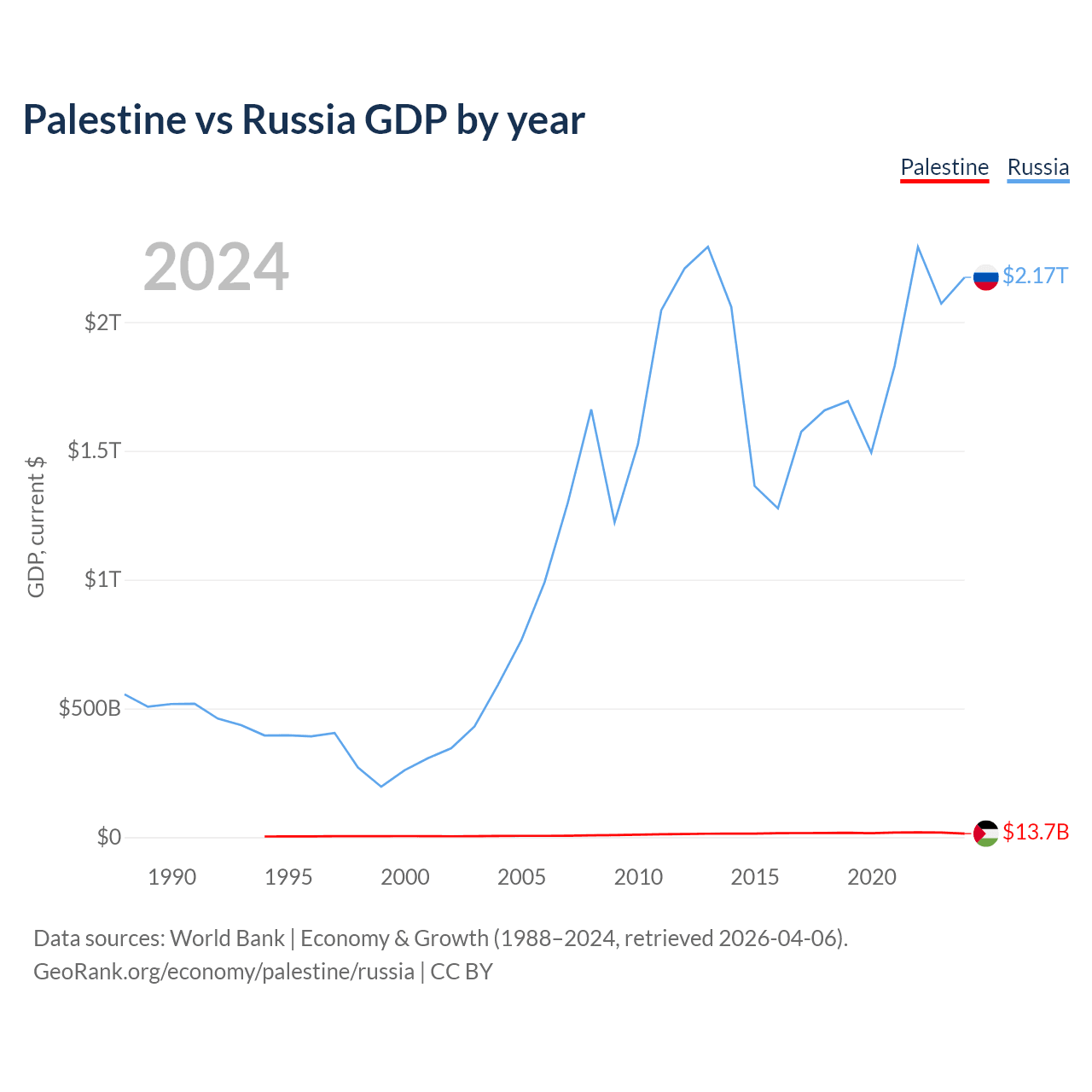 Palestine has a GDP of $13.7B compared to $2.17T for Russia, ranking 146/197 and 11/197 by economy size, respectively.