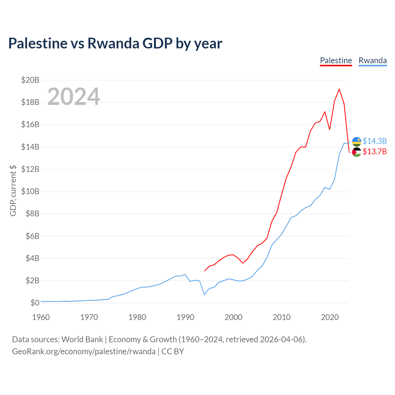 Palestine has a GDP of $13.7B compared to $14.3B for Rwanda, ranking 146/197 and 144/197 by economy size, respectively.