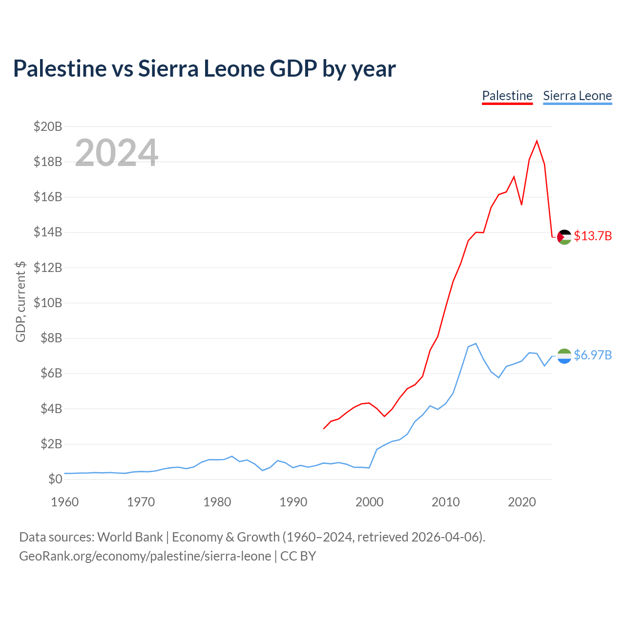 Palestine has a GDP of $13.7B compared to $6.97B for Sierra Leone, ranking 146/197 and 160/197 by economy size, respectively.
