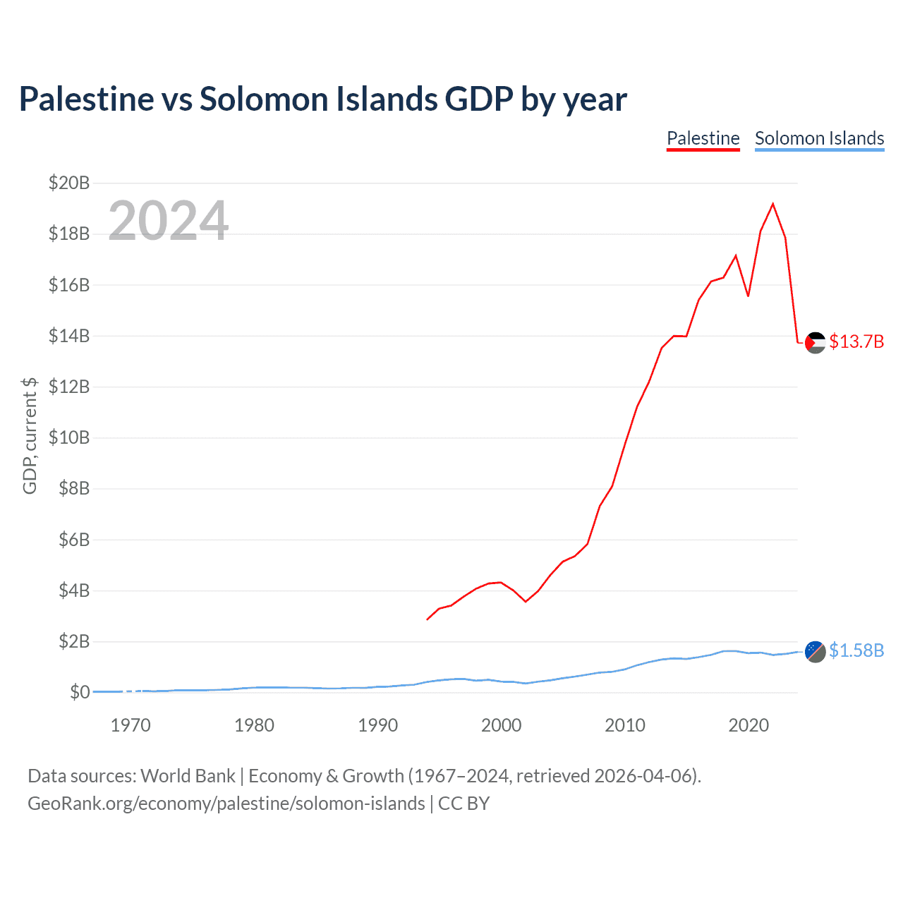 Palestine has a GDP of $13.7B compared to $1.58B for the Solomon Islands, ranking 146/197 and 182/197 by economy size, respectively.