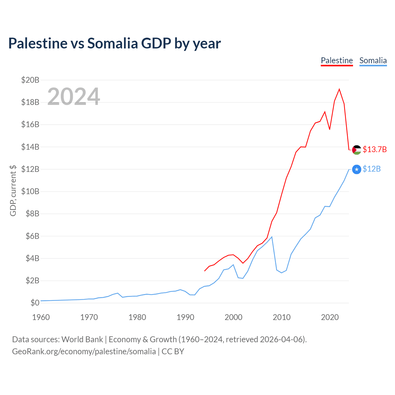 Palestine vs Somalia GDP by year