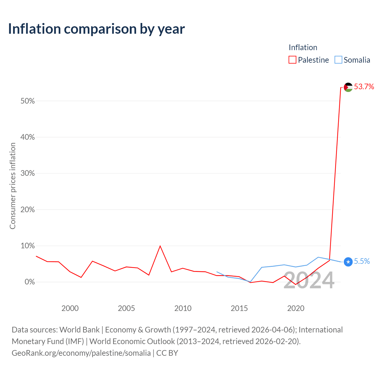 Over the past 12 years, Palestine has recorded an average annual inflation rate of 5.84%, compared with 3.77% in Somalia. In 2024, inflation was 53.7% in Palestine and 5.5% in Somalia.