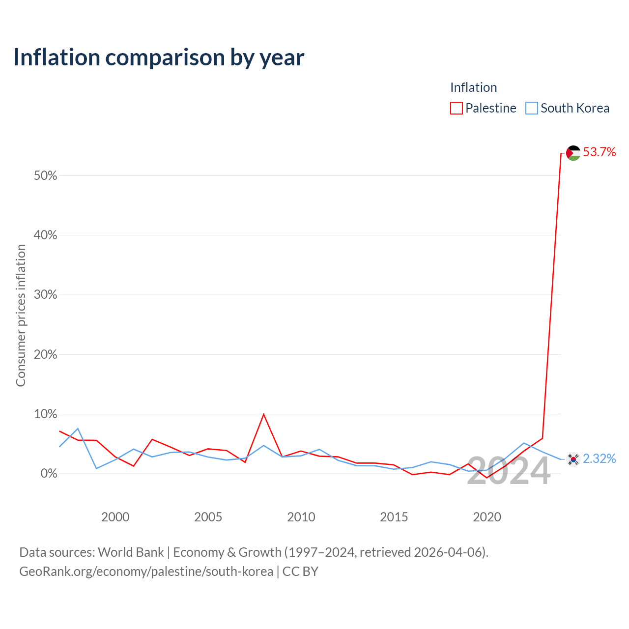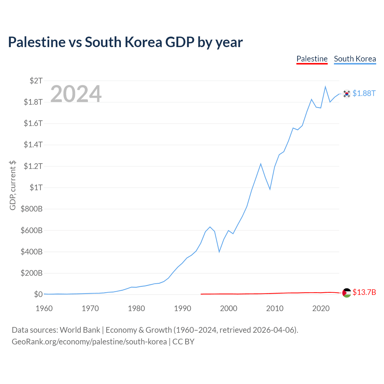 Palestine has a GDP of $13.7B compared to $1.88T for South Korea, ranking 146/197 and 12/197 by economy size, respectively.