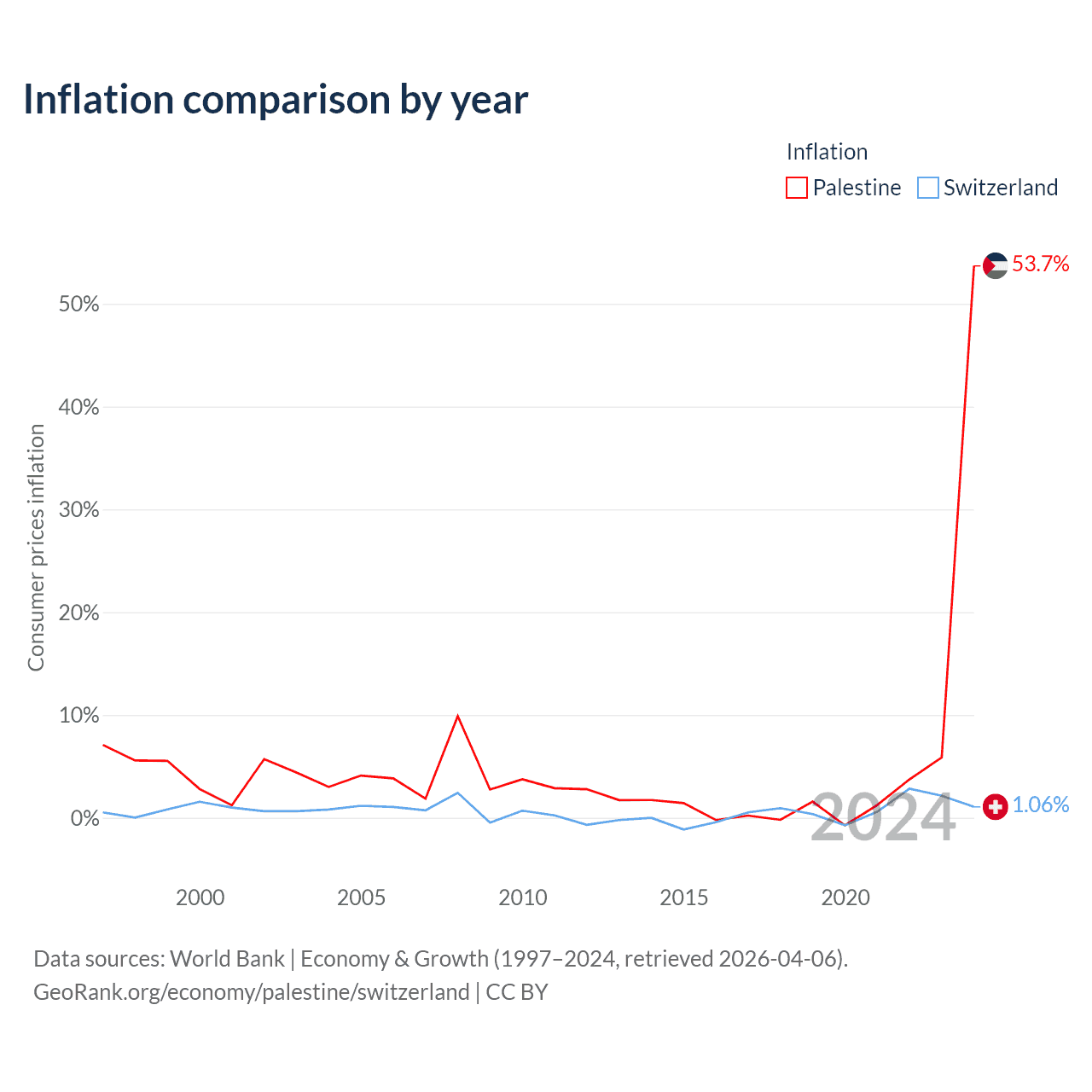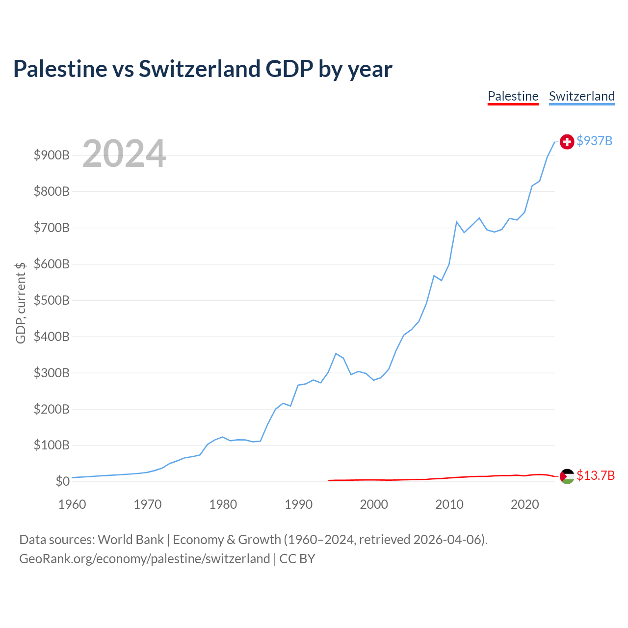 Palestine has a GDP of $13.7B compared to $937B for Switzerland, ranking 146/197 and 20/197 by economy size, respectively.