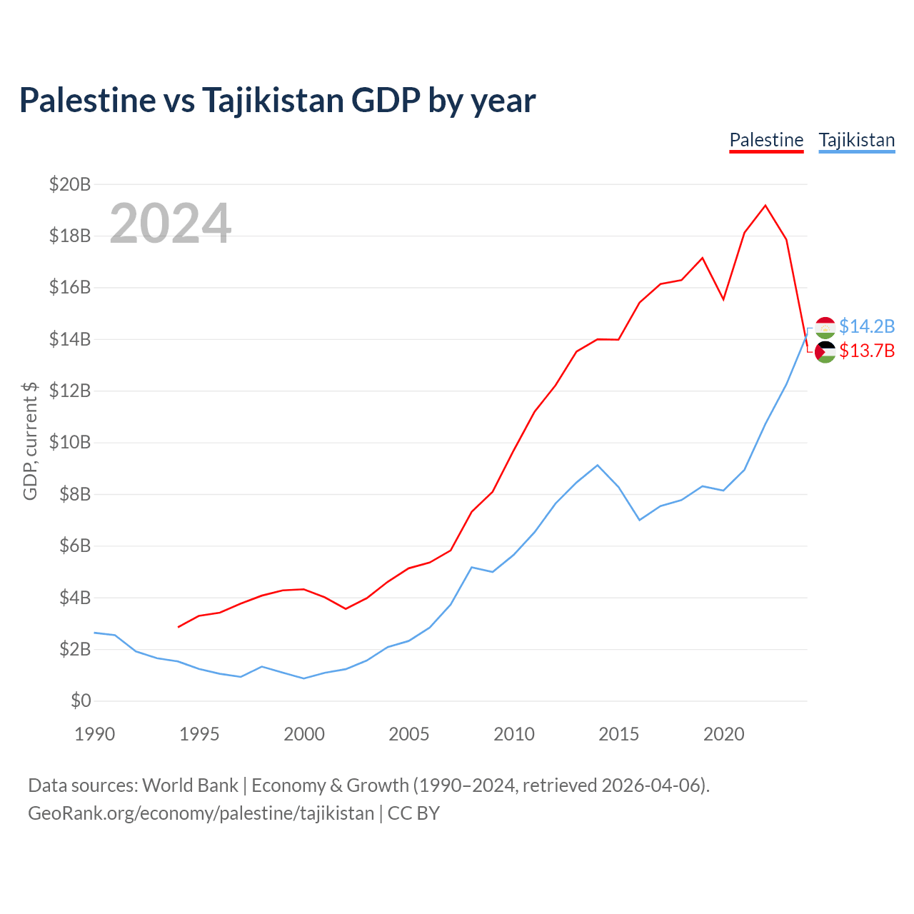 Palestine has a GDP of $13.7B compared to $14.2B for Tajikistan, ranking 146/197 and 145/197 by economy size, respectively.