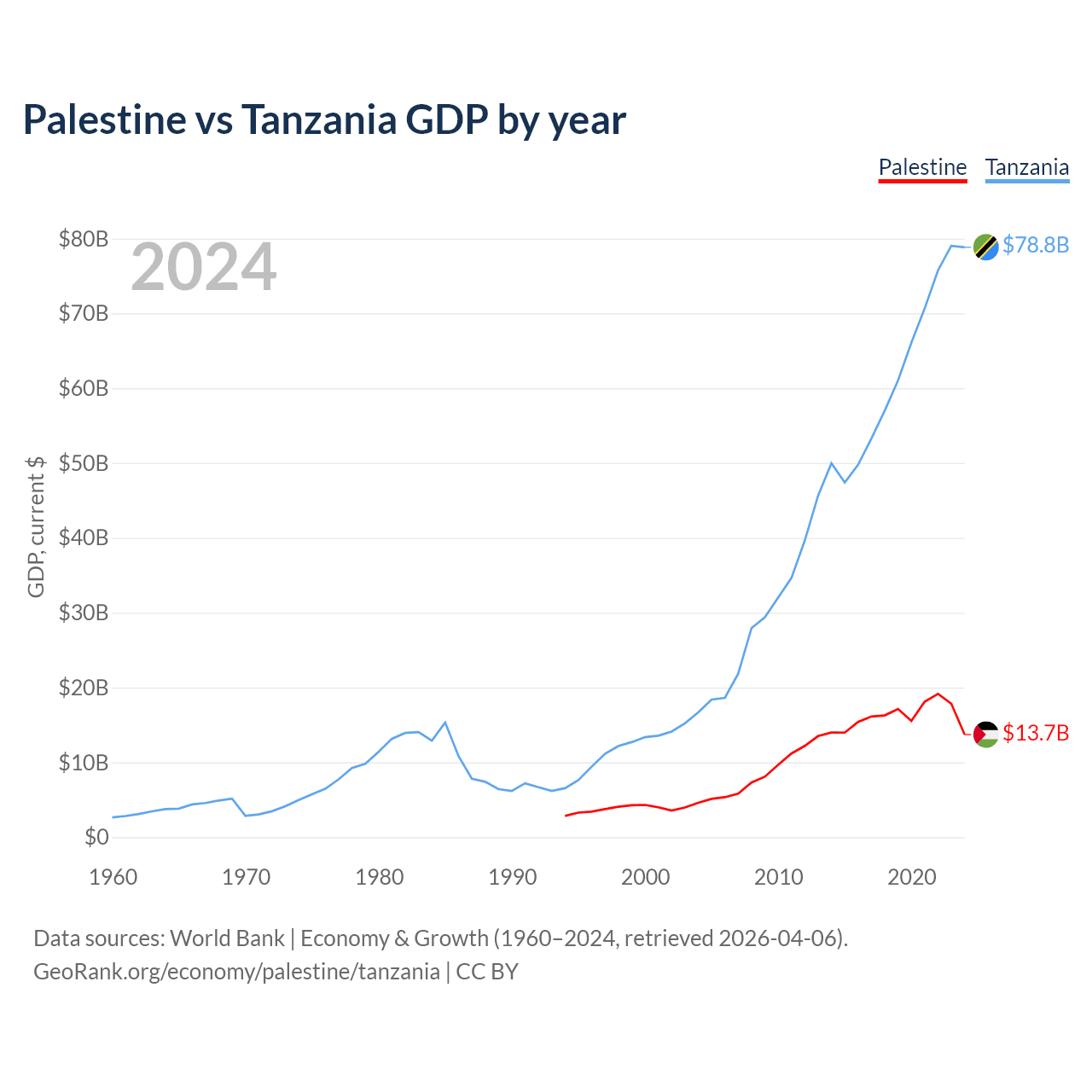 Palestine has a GDP of $13.7B compared to $78.8B for Tanzania, ranking 146/197 and 82/197 by economy size, respectively.