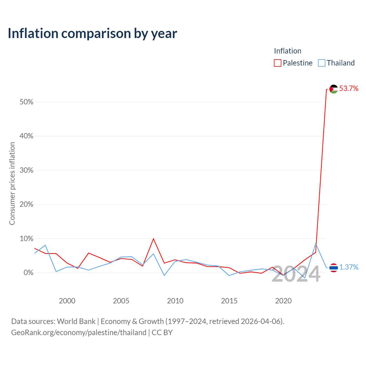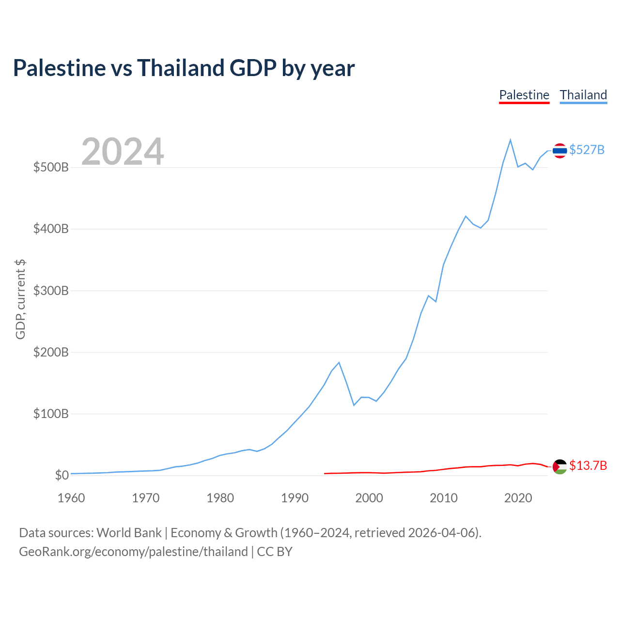Palestine has a GDP of $13.7B compared to $527B for Thailand, ranking 146/197 and 31/197 by economy size, respectively.