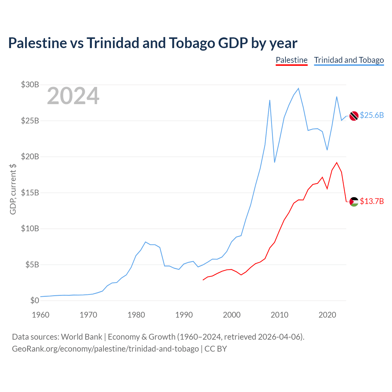Palestine has a GDP of $13.7B compared to $25.6B for Trinidad and Tobago, ranking 146/197 and 115/197 by economy size, respectively.