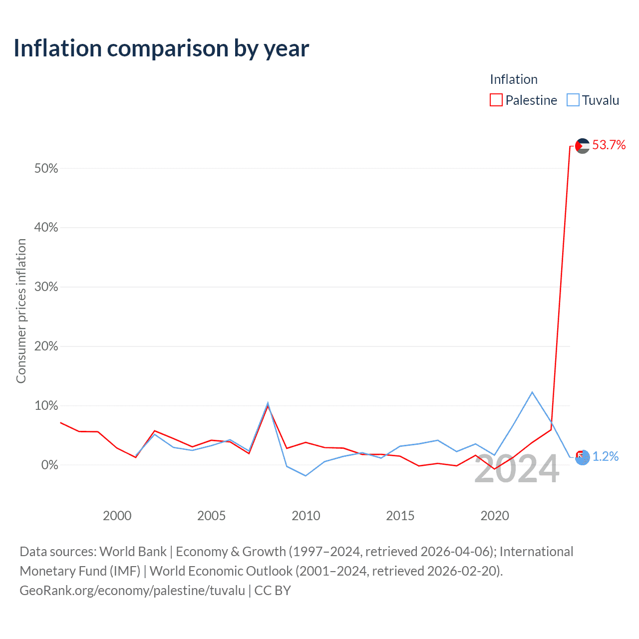 Over the past 24 years, Palestine has recorded an average annual inflation rate of 4.84%, compared with 3.34% in Tuvalu. In 2024, inflation was 53.7% in Palestine and 1.2% in Tuvalu.