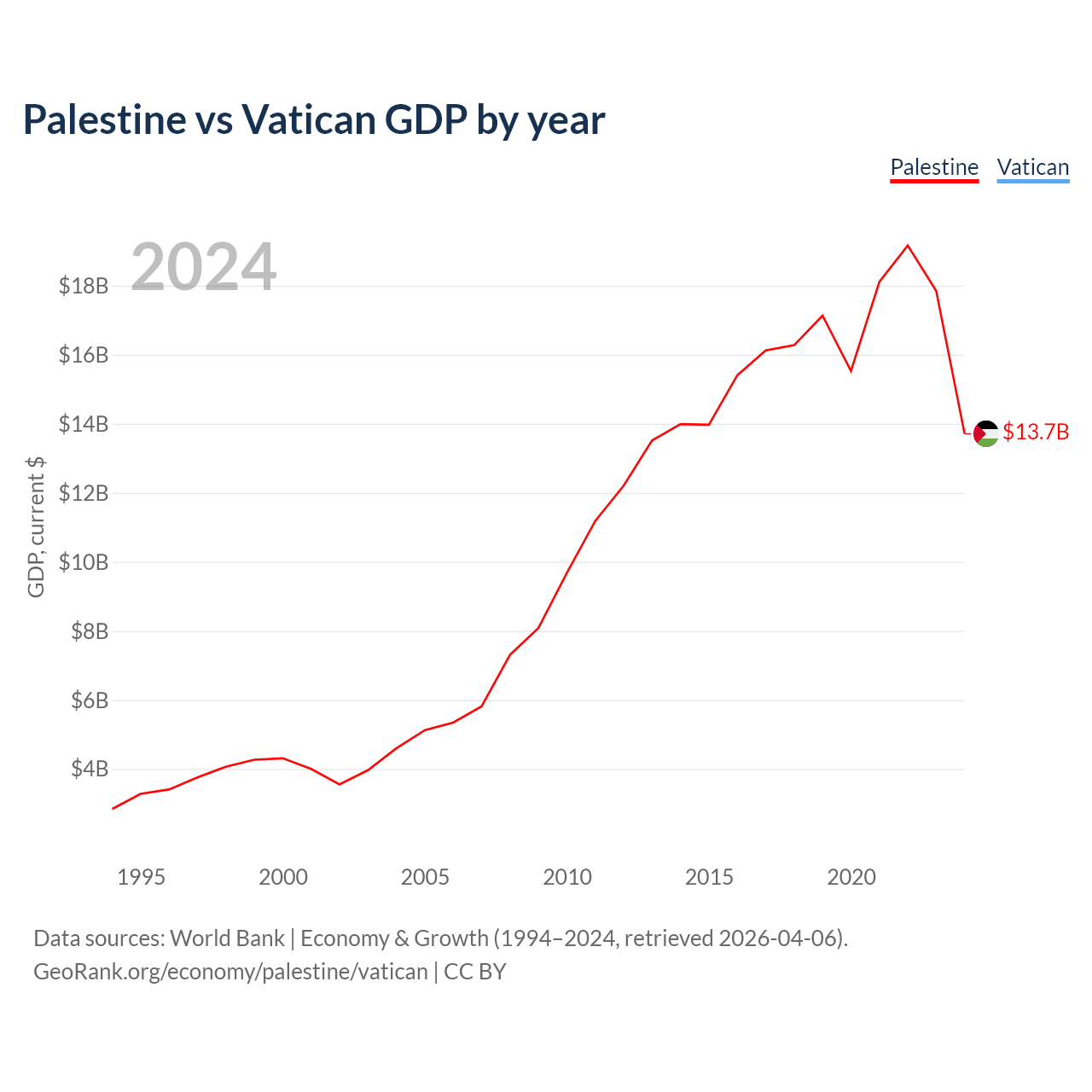 Palestine has a GDP of $13.7B compared to $19.8M for the Vatican, ranking 146/197 and 197/197 by economy size, respectively.