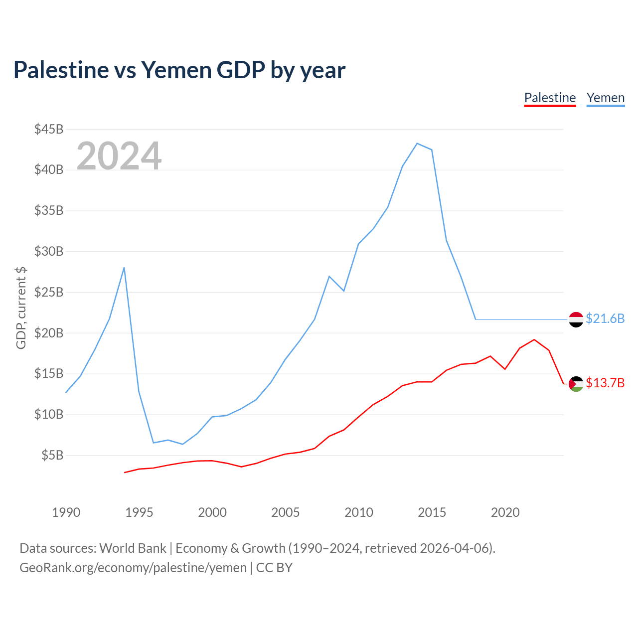 Palestine vs Yemen GDP by year