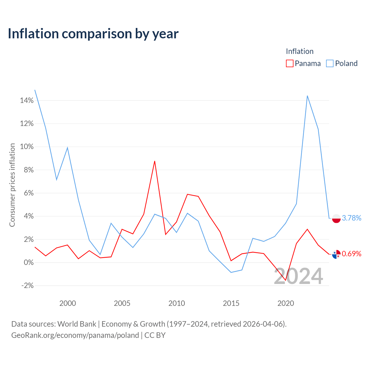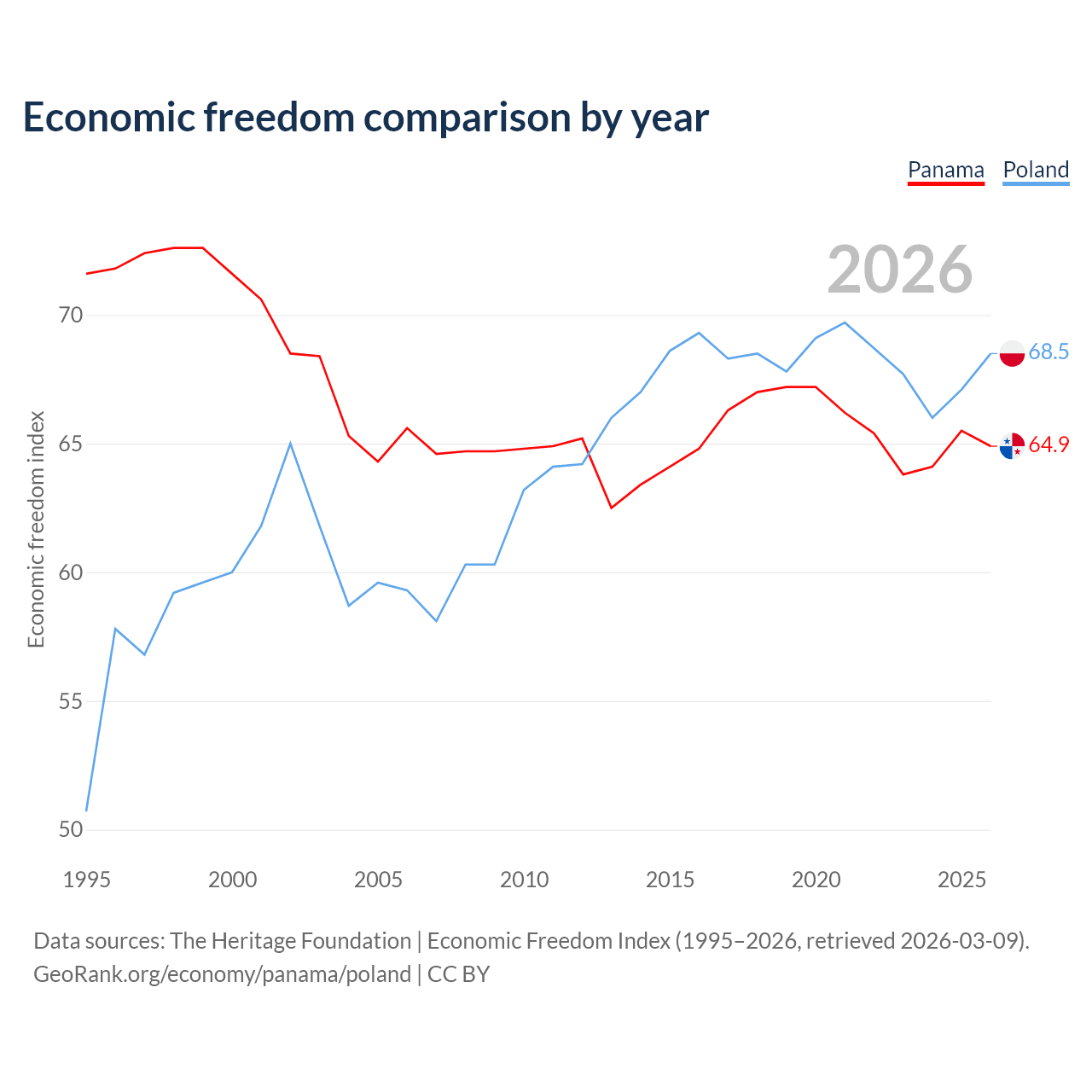 The Economic Freedom Index for Panama is 64.9, ranking 70/197, compared to 68.5 for Poland, ranking 46/197. The chart above displays a comparison of annual changes in economic freedom indexes.