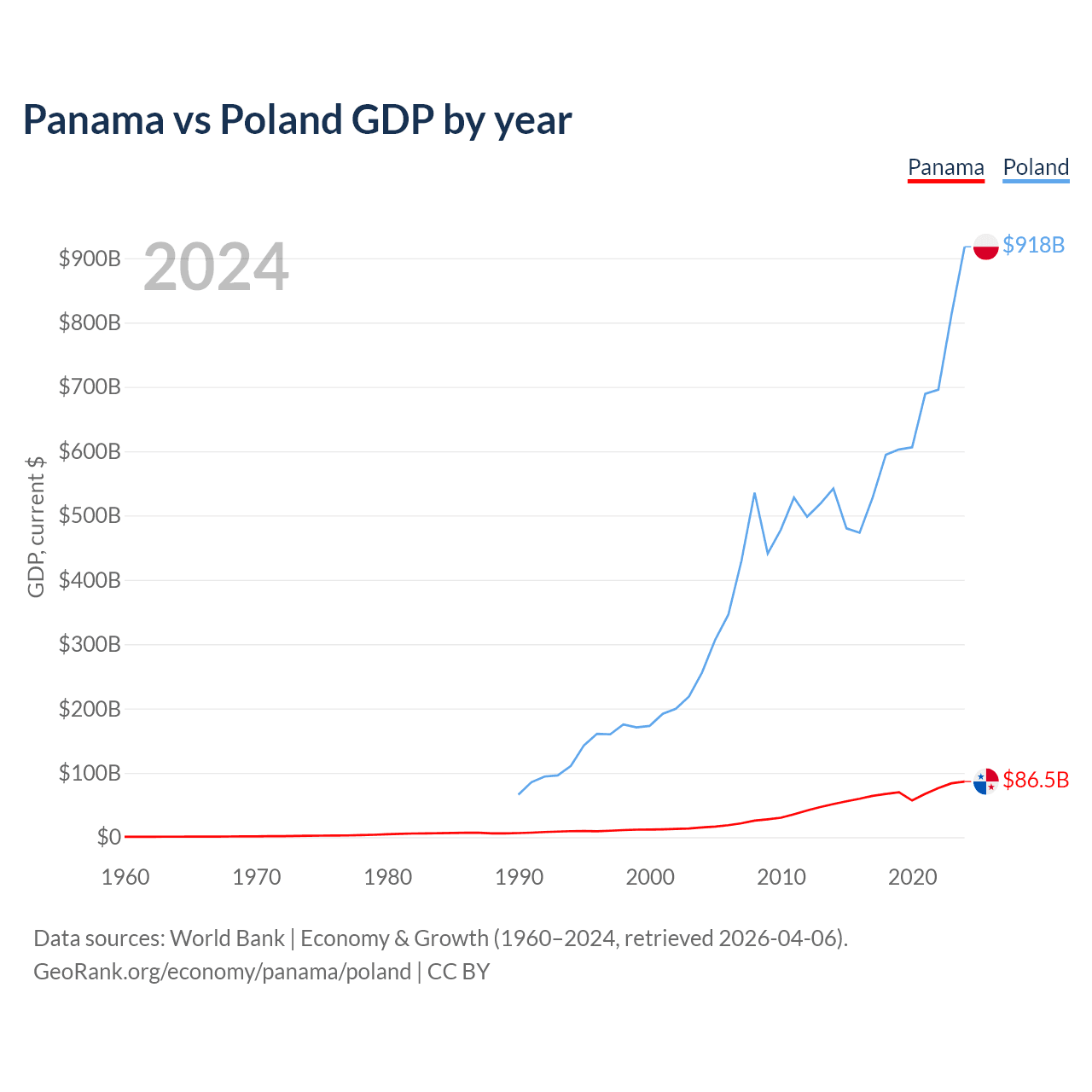 Panama has a GDP of $86.5B compared to $918B for Poland, ranking 78/197 and 21/197 by economy size, respectively.