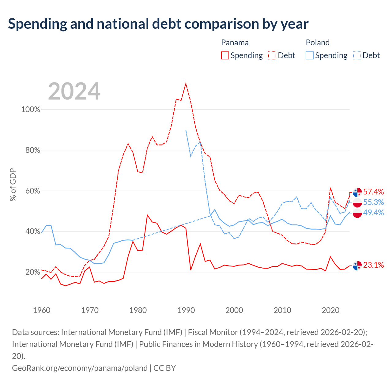Panama has $49.6B in government debt (57.4% of GDP), compared to $507B (55.3% of GDP) in Poland.