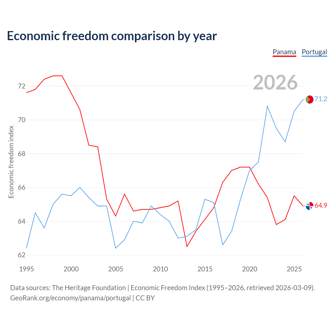 Data sources: The Heritage Foundation | Economic Freedom Index (1995–2026, retrieved 2026-03-09).
