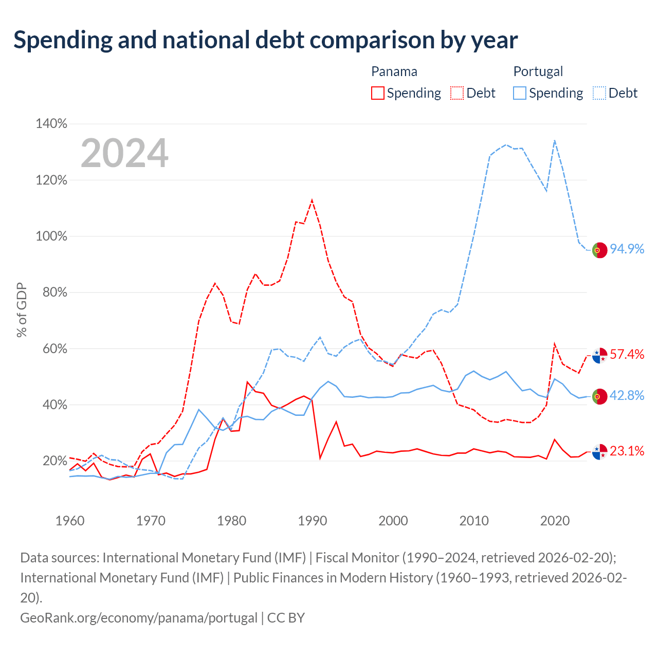 Panama has $49.6B in government debt (57.4% of GDP), compared to $297B (94.9% of GDP) in Portugal.