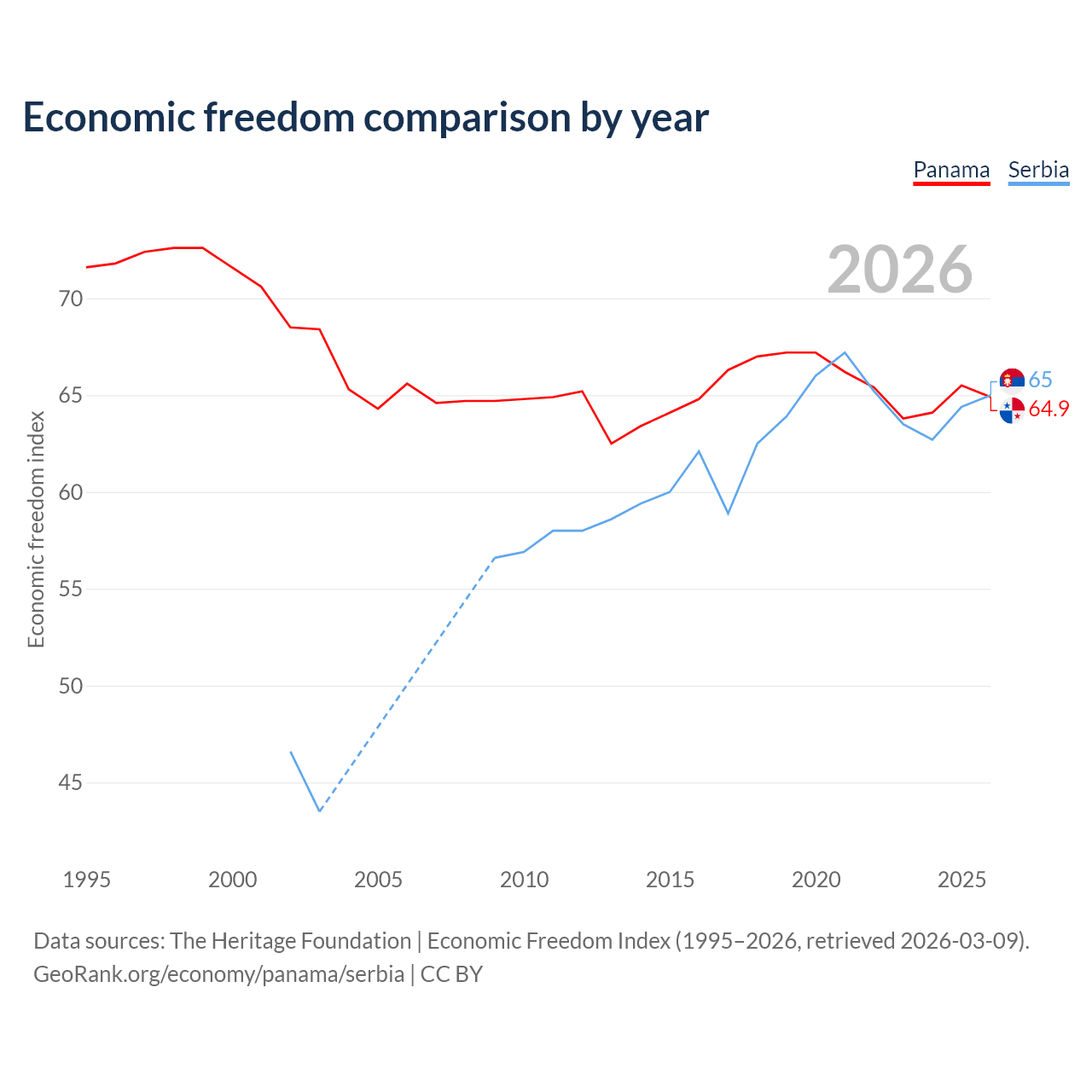 The Economic Freedom Index for Panama is 64.9, ranking 70/197, compared to 65 for Serbia, ranking 68/197. The chart above displays a comparison of annual changes in economic freedom indexes.