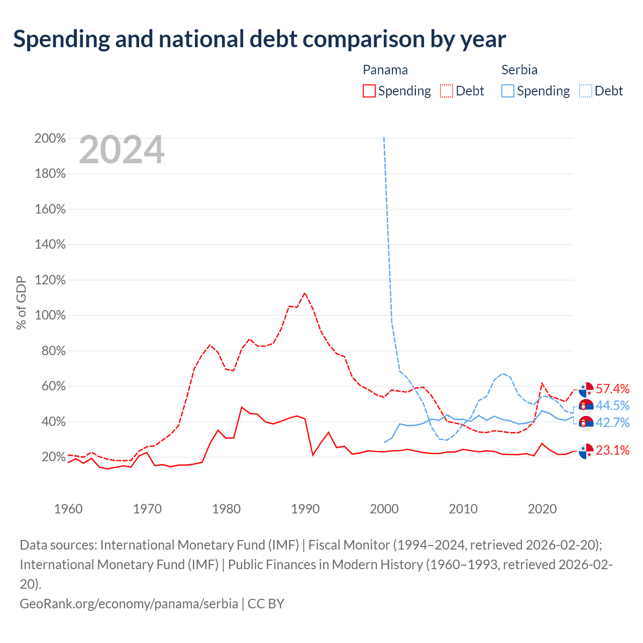Panama has $49.6B in government debt (57.4% of GDP), compared to $40.1B (44.5% of GDP) in Serbia.
