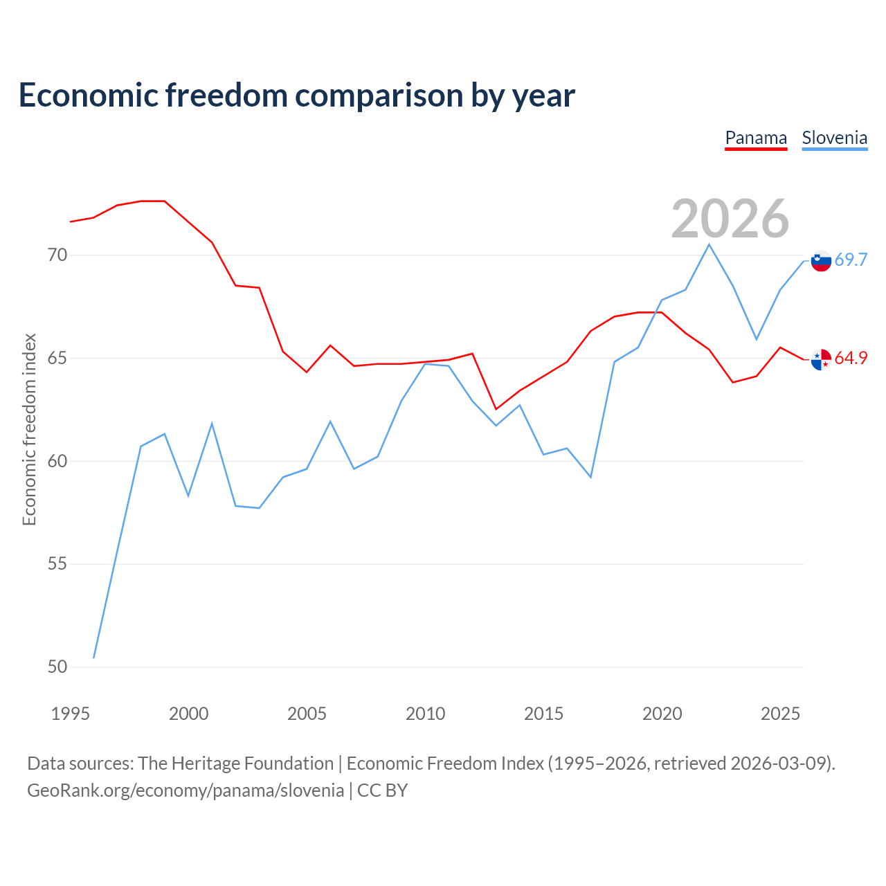 The Economic Freedom Index for Panama is 64.9, ranking 70/197, compared to 69.7 for Slovenia, ranking 40/197. The chart above displays a comparison of annual changes in economic freedom indexes.