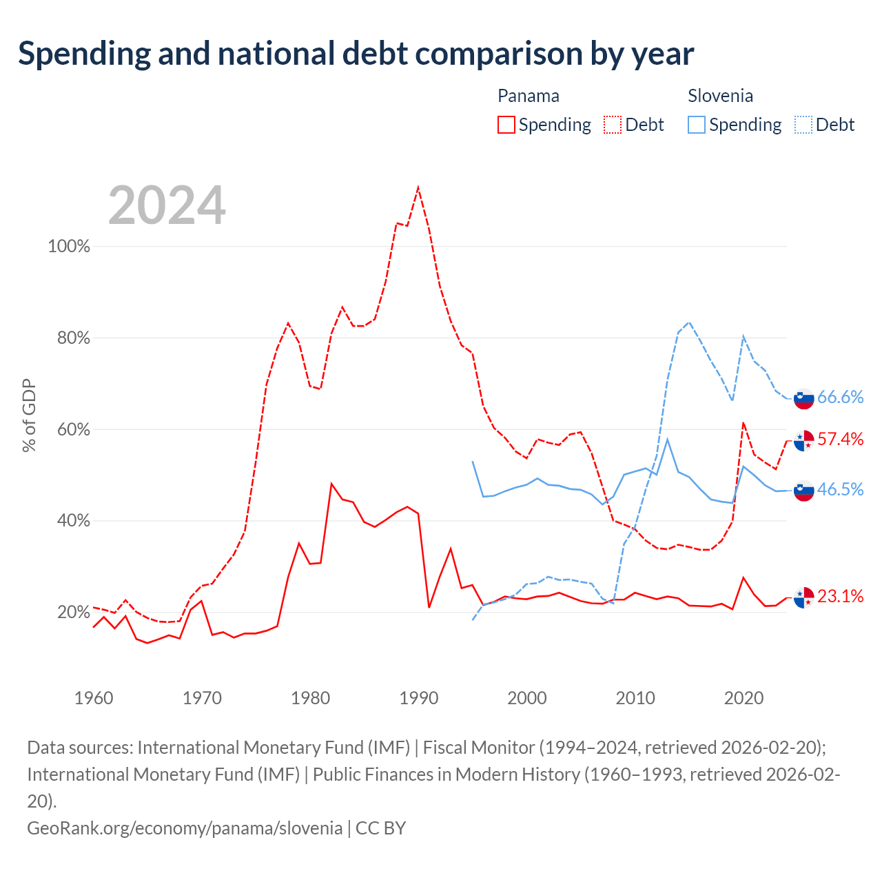 Panama has $49.6B in government debt (57.4% of GDP), compared to $48.6B (66.6% of GDP) in Slovenia.