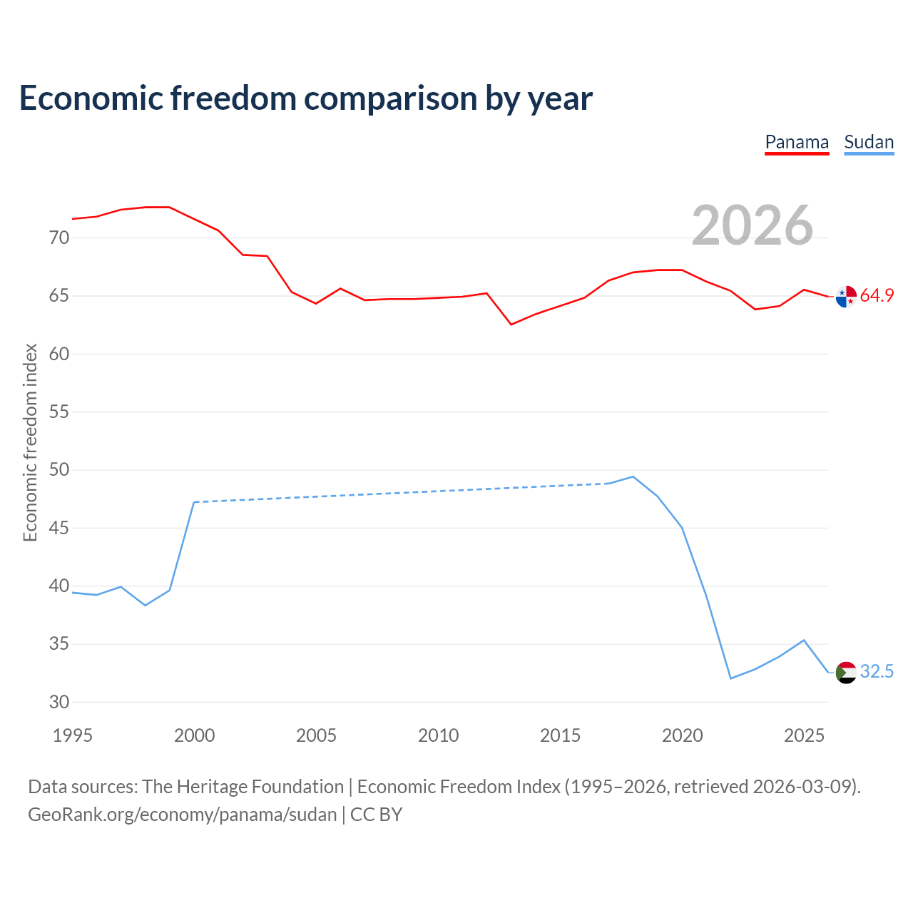 The Economic Freedom Index for Panama is 64.9, ranking 70/197, compared to 32.5 for Sudan, ranking 191/197. The chart above displays a comparison of annual changes in economic freedom indexes.