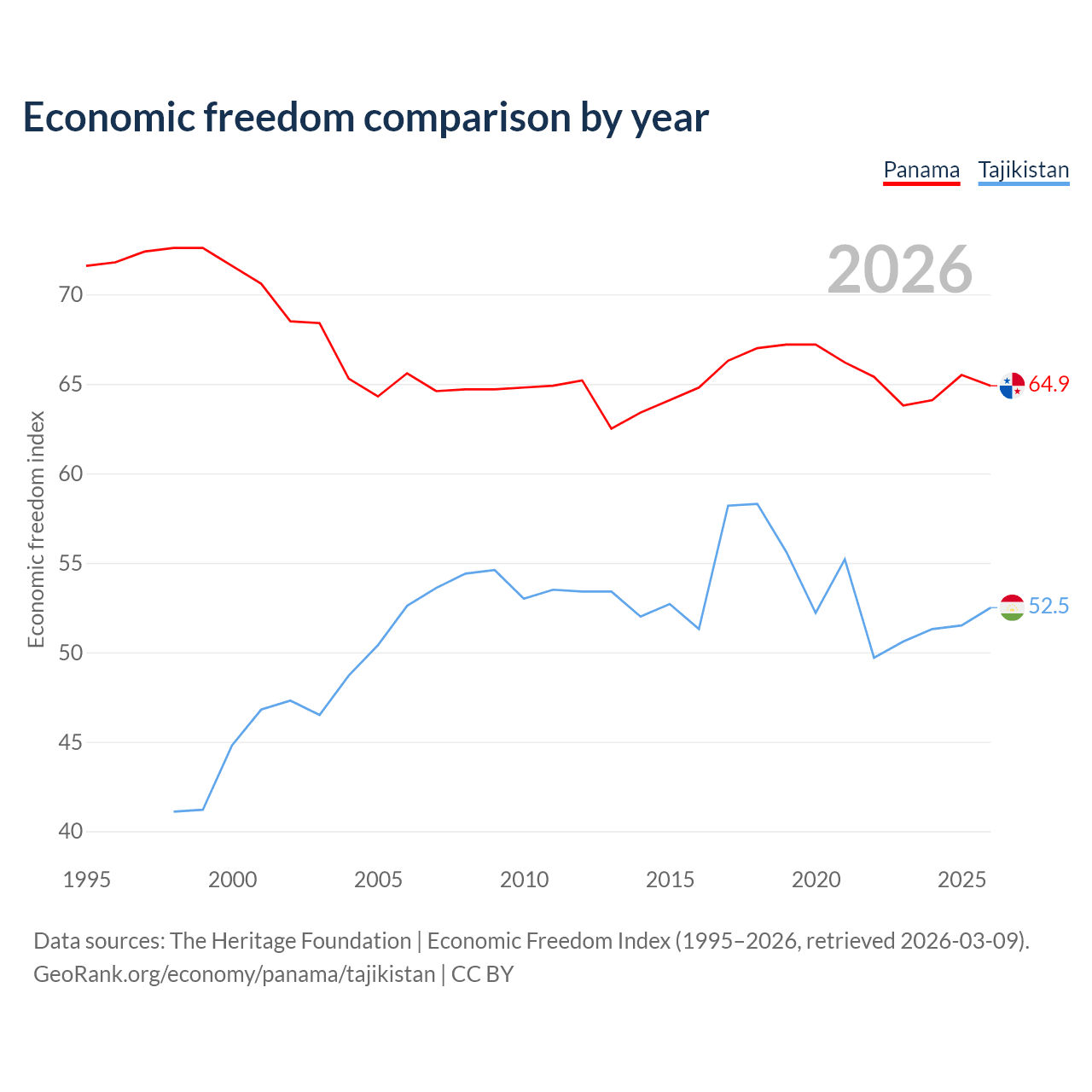 The Economic Freedom Index for Panama is 64.9, ranking 70/197, compared to 52.5 for Tajikistan, ranking 147/197. The chart above displays a comparison of annual changes in economic freedom indexes.