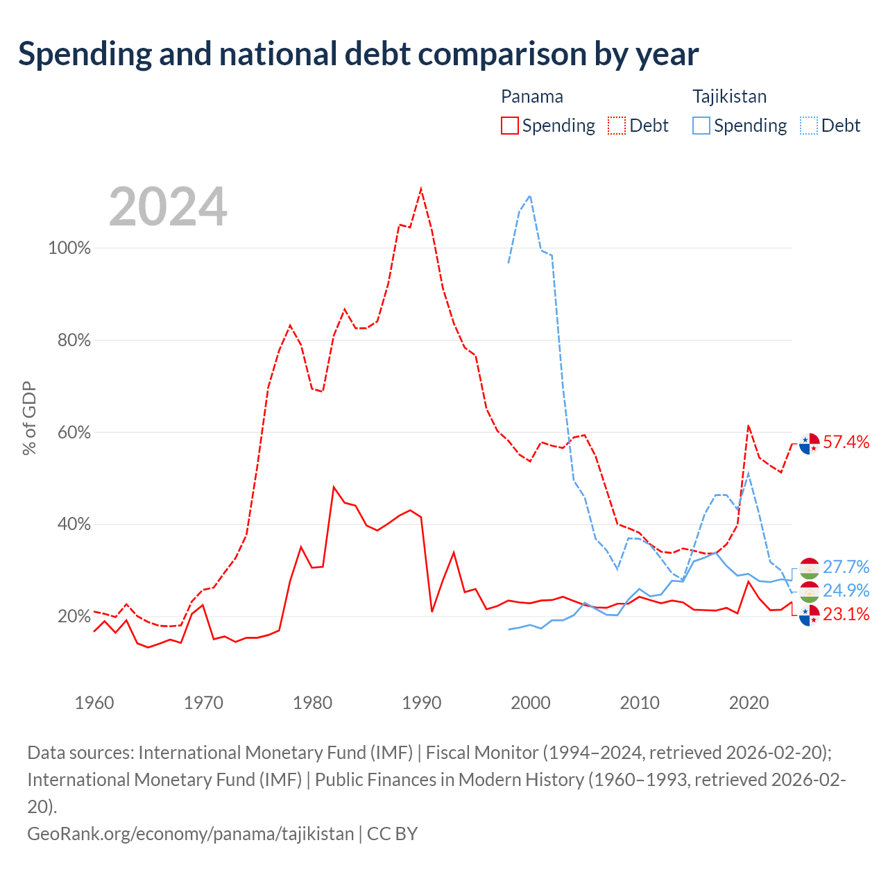 Panama has $49.6B in government debt (57.4% of GDP), compared to $3.54B (24.9% of GDP) in Tajikistan.